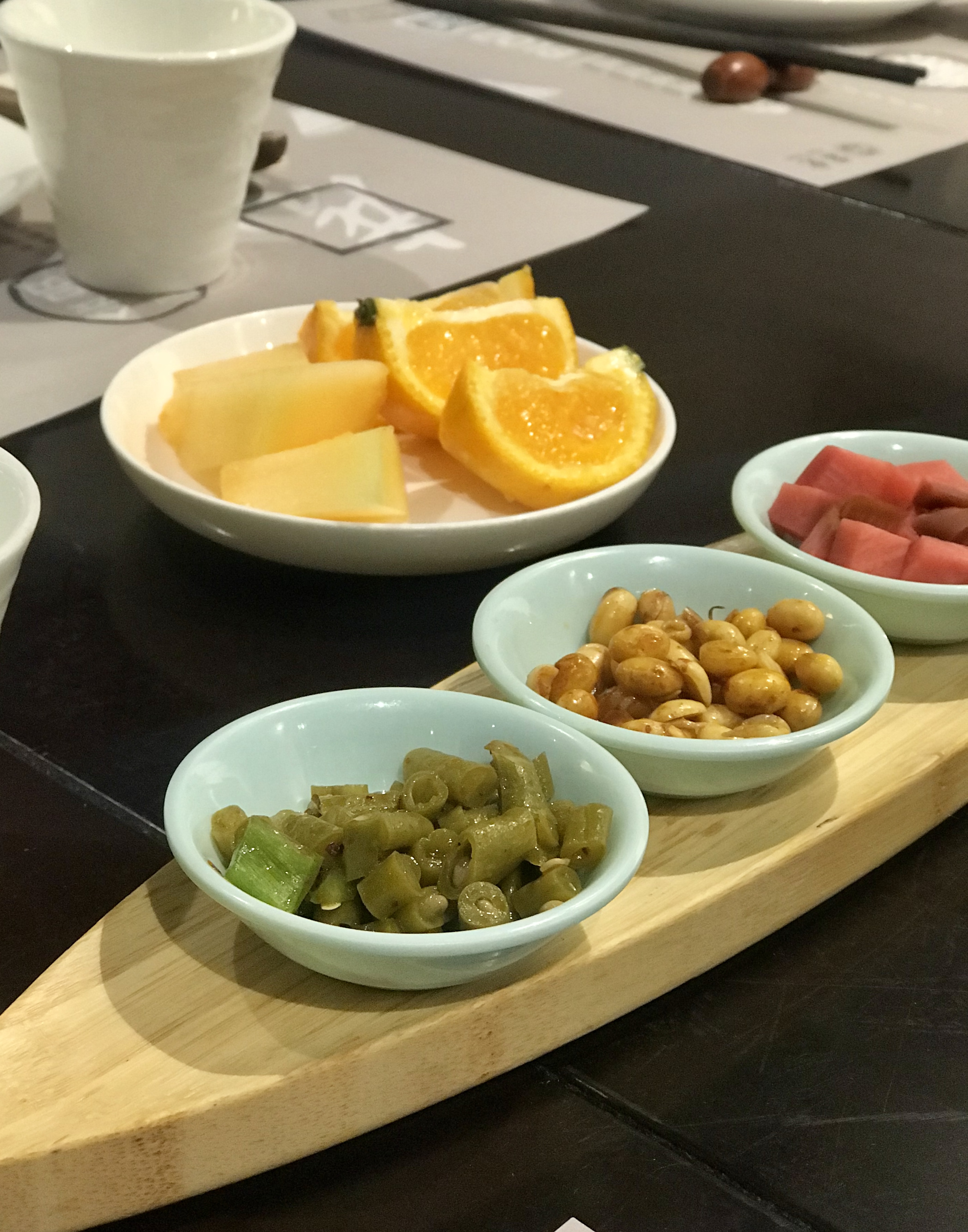 免费送的水果和开胃小菜。开胃小菜是粉嘟嘟的泡菜萝卜、酱油焖黄豆、酸豆角。