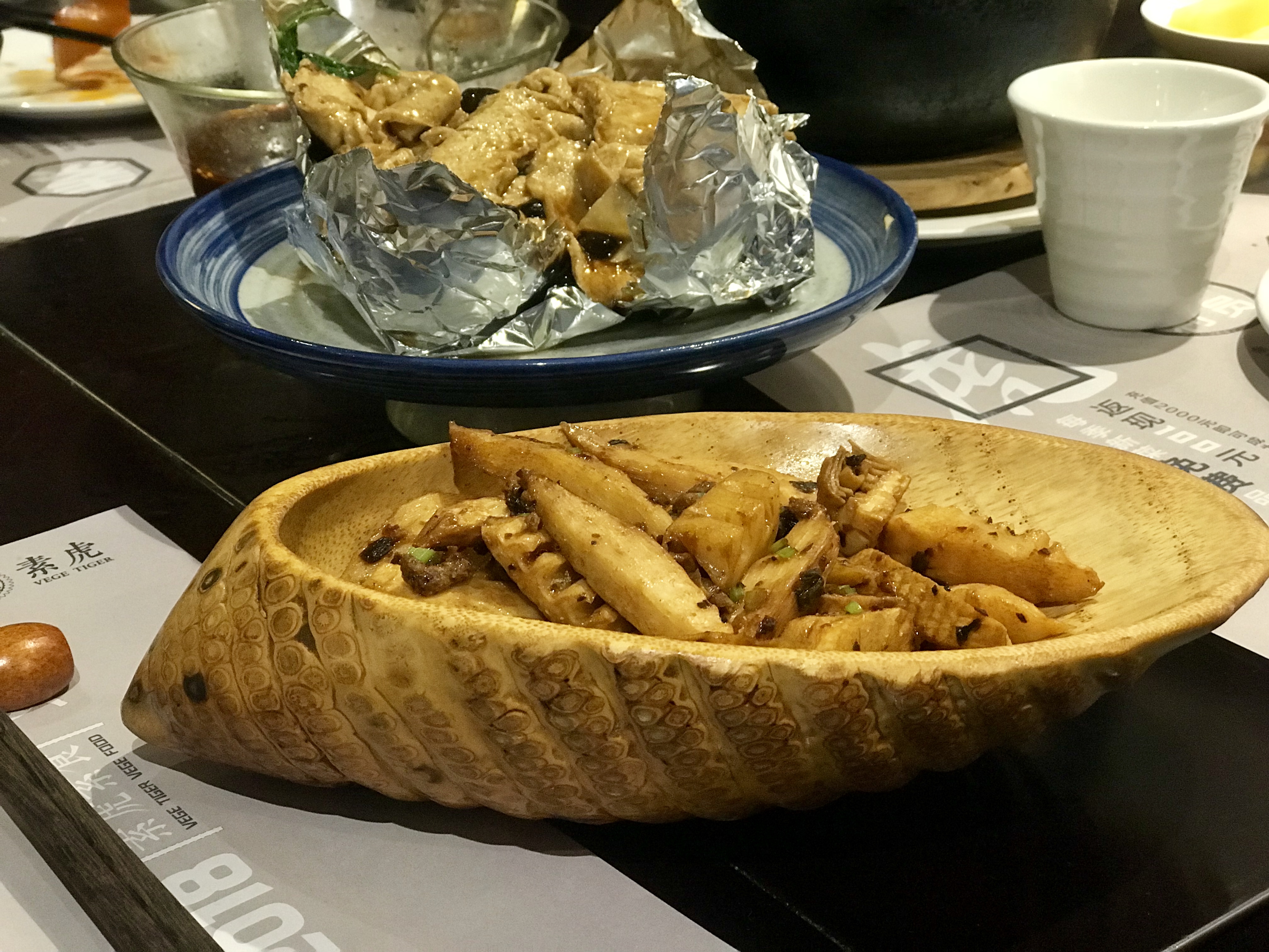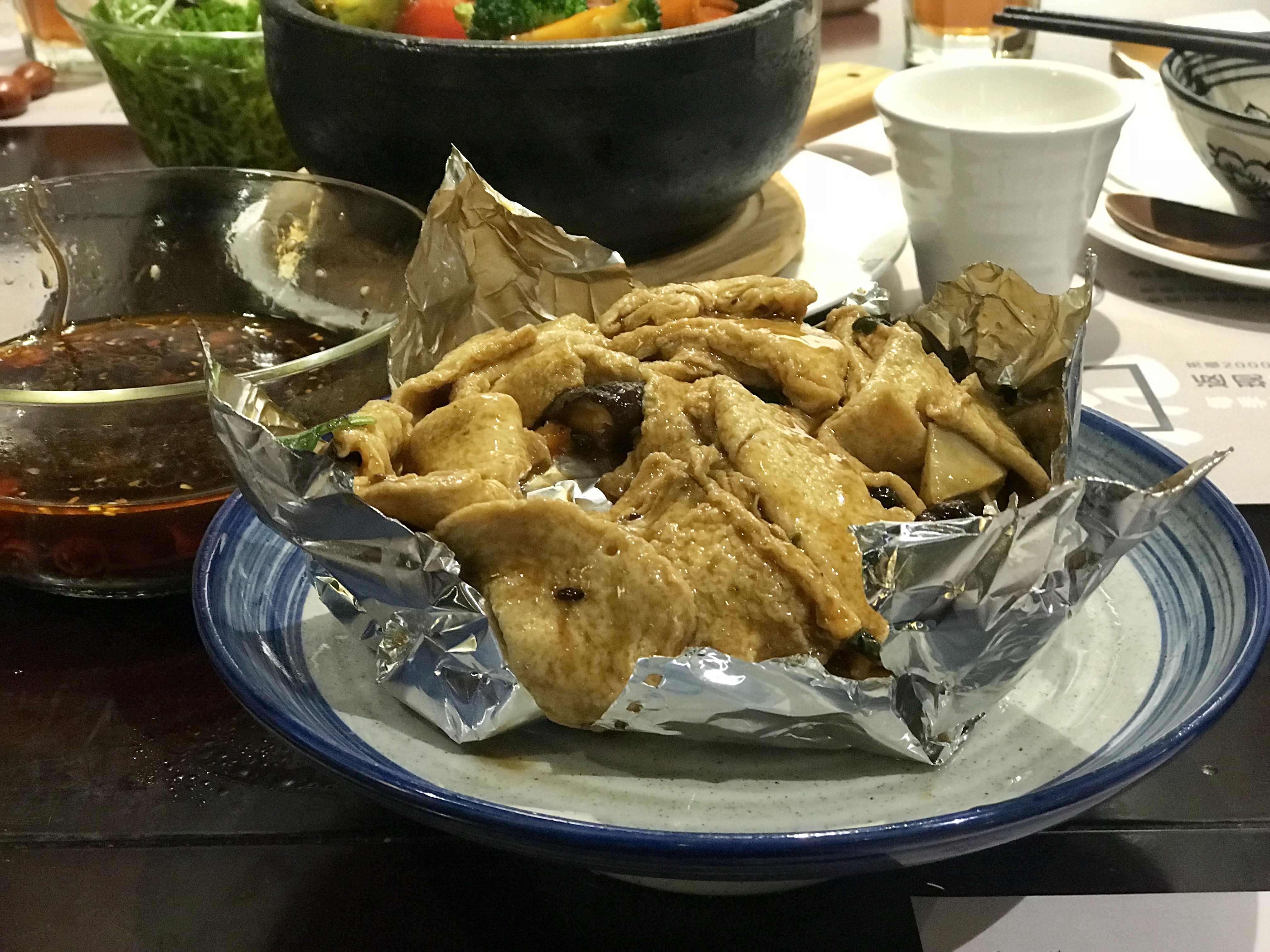 火焰豆腐,原以为是要有火苗在千页豆腐上面升腾,但等服务员切开锡纸也未见一丝火,后来我们几个人琢磨上了,这火焰是不是指的锡纸的四个角啊?