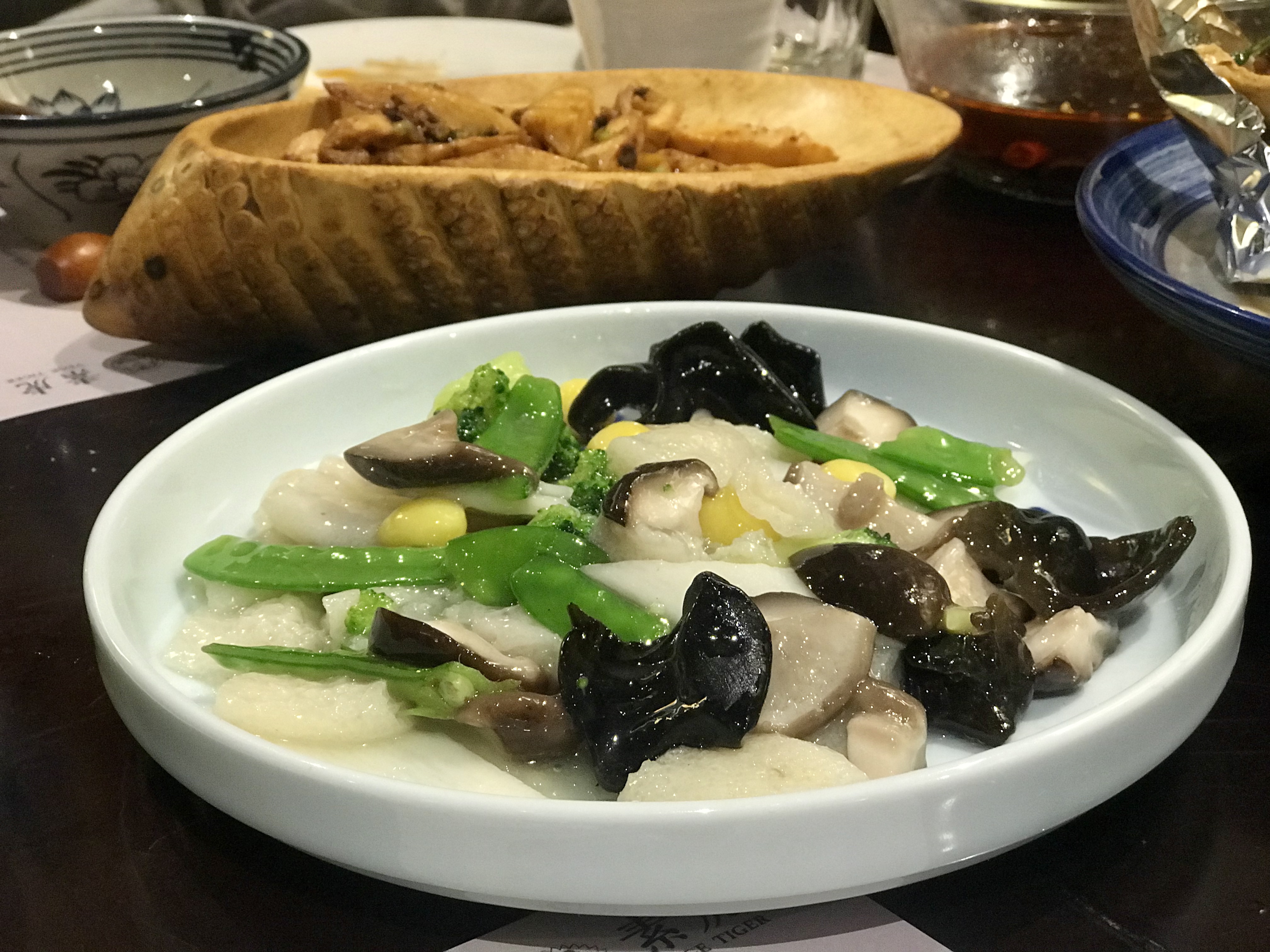 时蔬蘑菇烩,黑白黄绿一道看着就清爽。黑木耳、白山药、白银耳、白竹荪、黄银杏果、绿荷兰豆,因为勾了薄芡,所以能挂住鲜味。