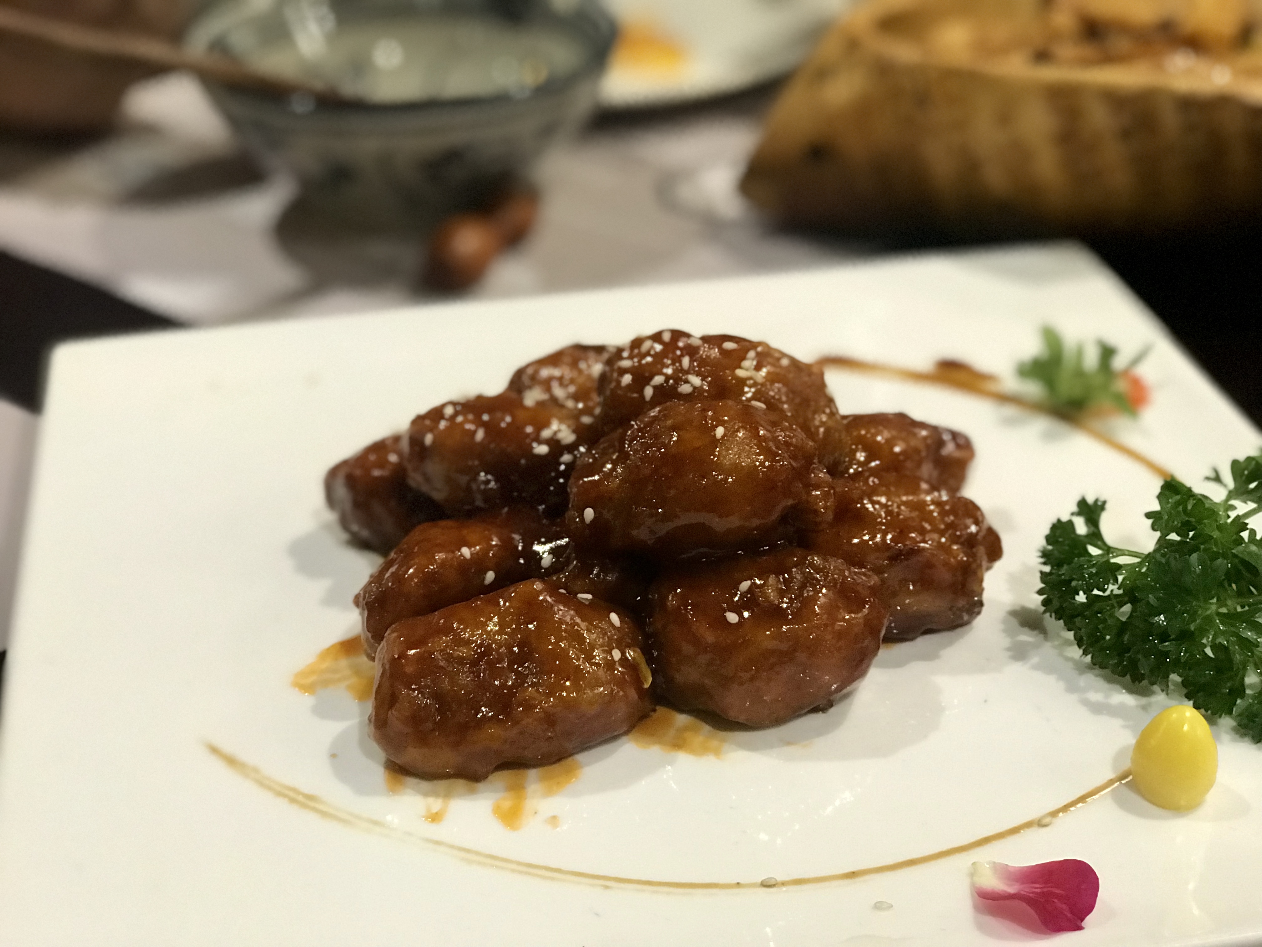 最让人叫绝的是这道糖醋小排。光从形状和色泽上就和真的糖醋小排很像。夹一块尝尝,骨头是用莲藕做的,肉是用干豆腐皮裹着平菇,再外蘸淀粉炸制而成。那平菇又鲜又嫩还紧实,咬一口还真像是瘦肉丝。