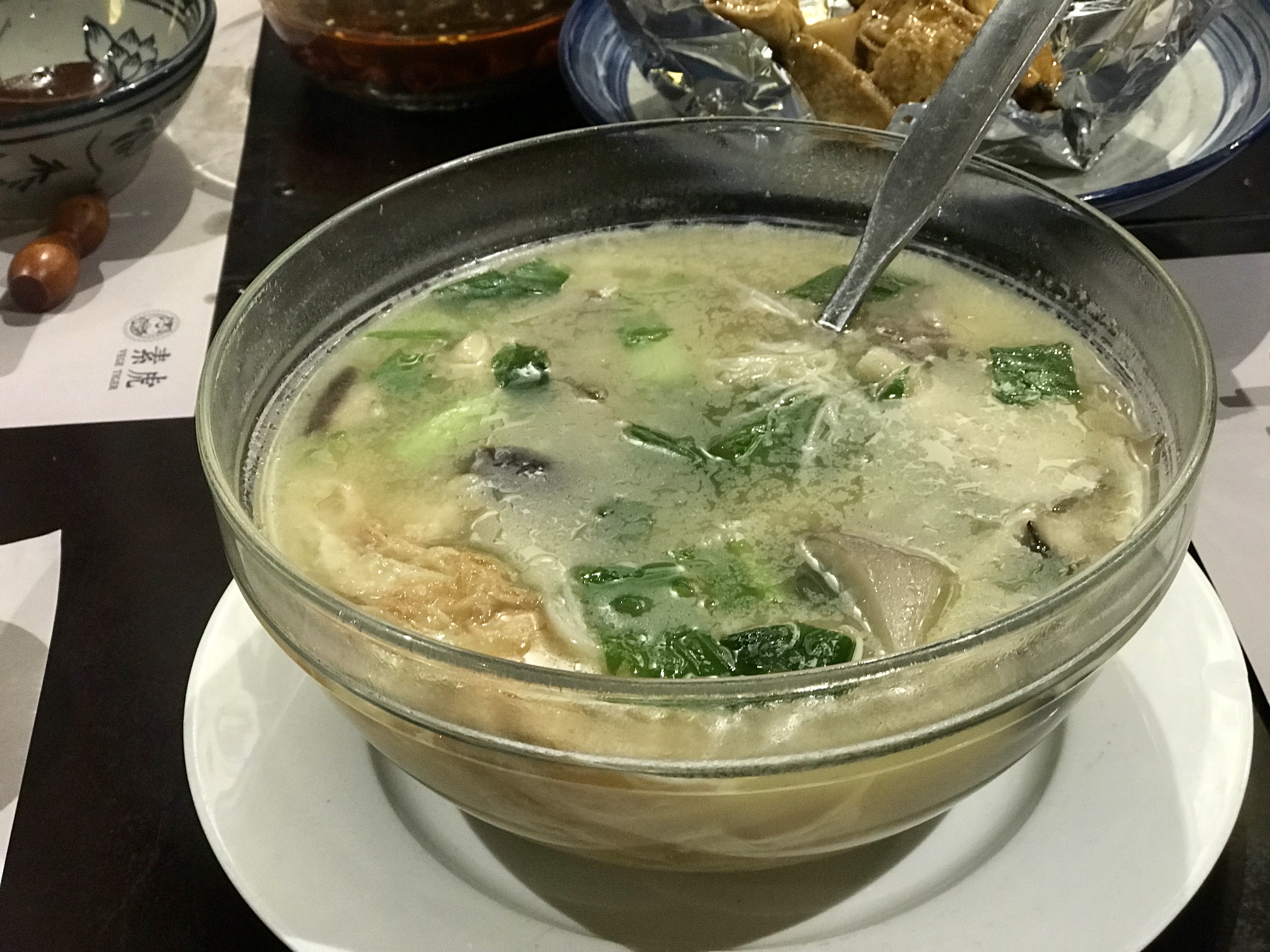 这一大碗鲜菇蔬菜汤,里面看着像是鸡蛋花的物体你不吃都想不到是什么。是炸过的腐竹再来煮,那形状和口感真跟浓厚的鸡蛋花很像。