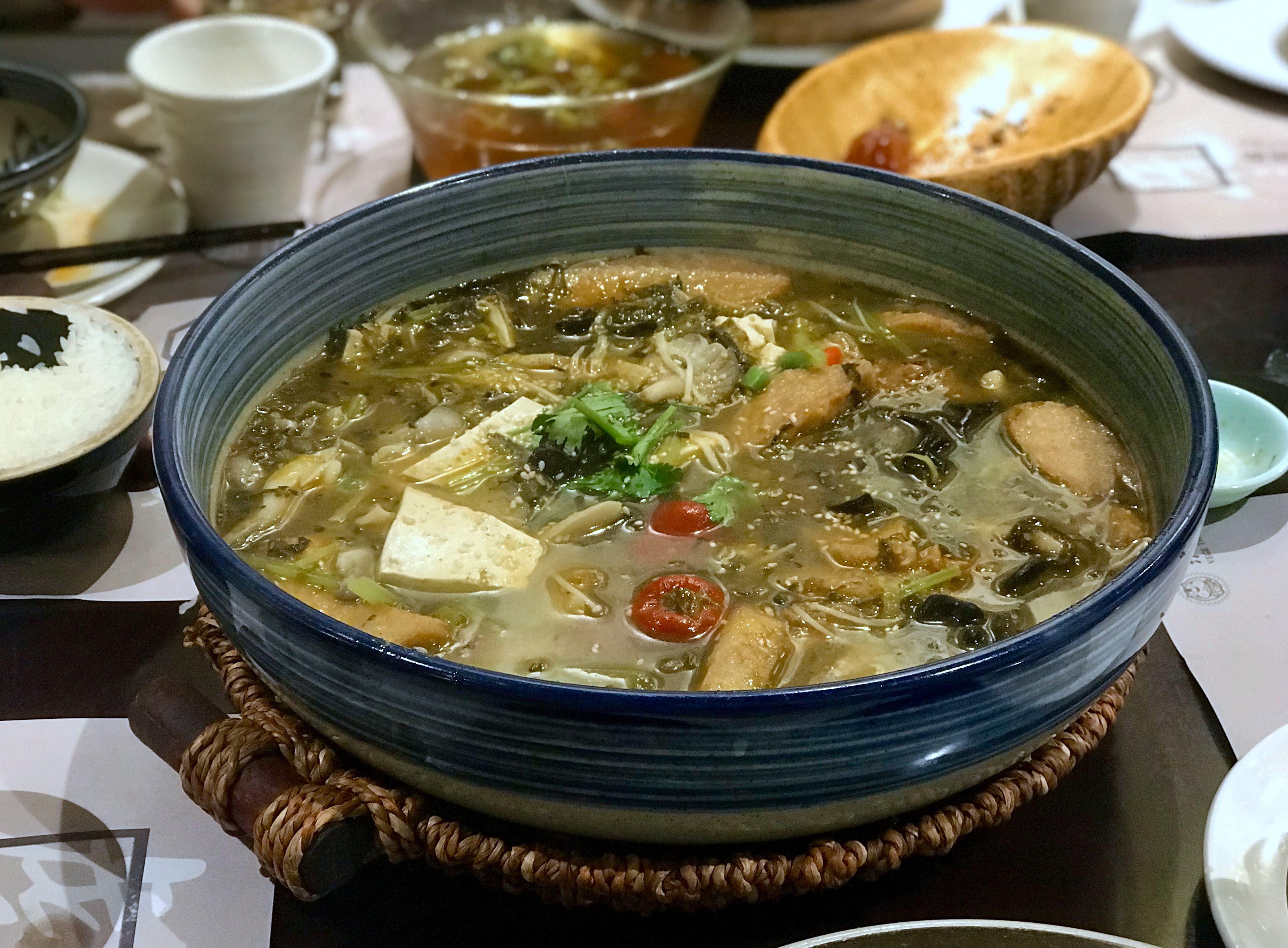 这几个菜大家吃得很尽兴,但似乎清淡了些,还有些意犹未尽之感,不要紧,咱随时点菜,就来一盆川府酸辣烩吧。有干有稀还真是下饭。70出头的大姐夫居然就这酸辣汤泡饭,呼噜噜吃掉一碗饭。剩下半盆几个人实在吃不下了,打包带回家,晚上煮了一锅热汤面,真过瘾!