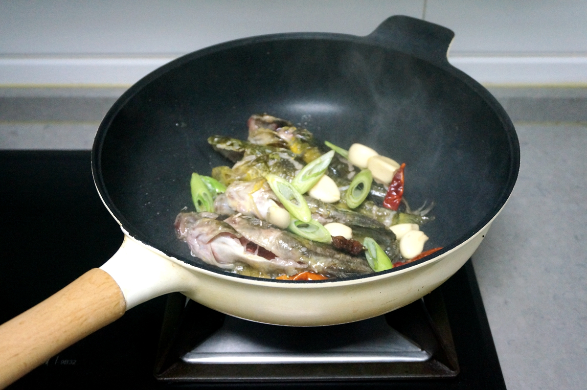 材料:嘎鱼4条,大葱半棵,大蒜1头,干红辣椒4个,八角1颗,香叶1片,紫苏叶1把,油少许,酱油适量,盐少许