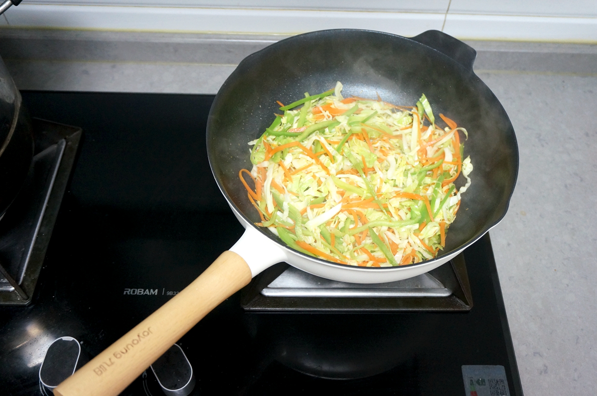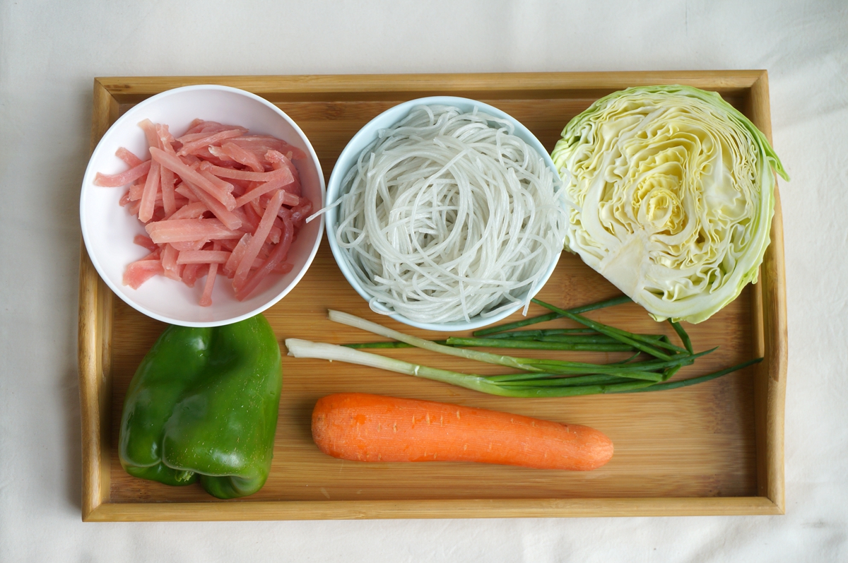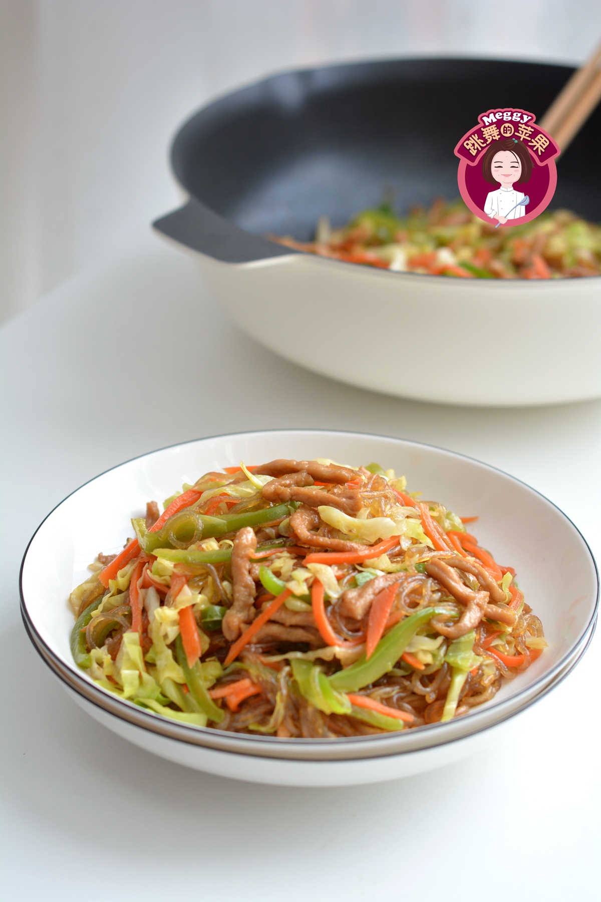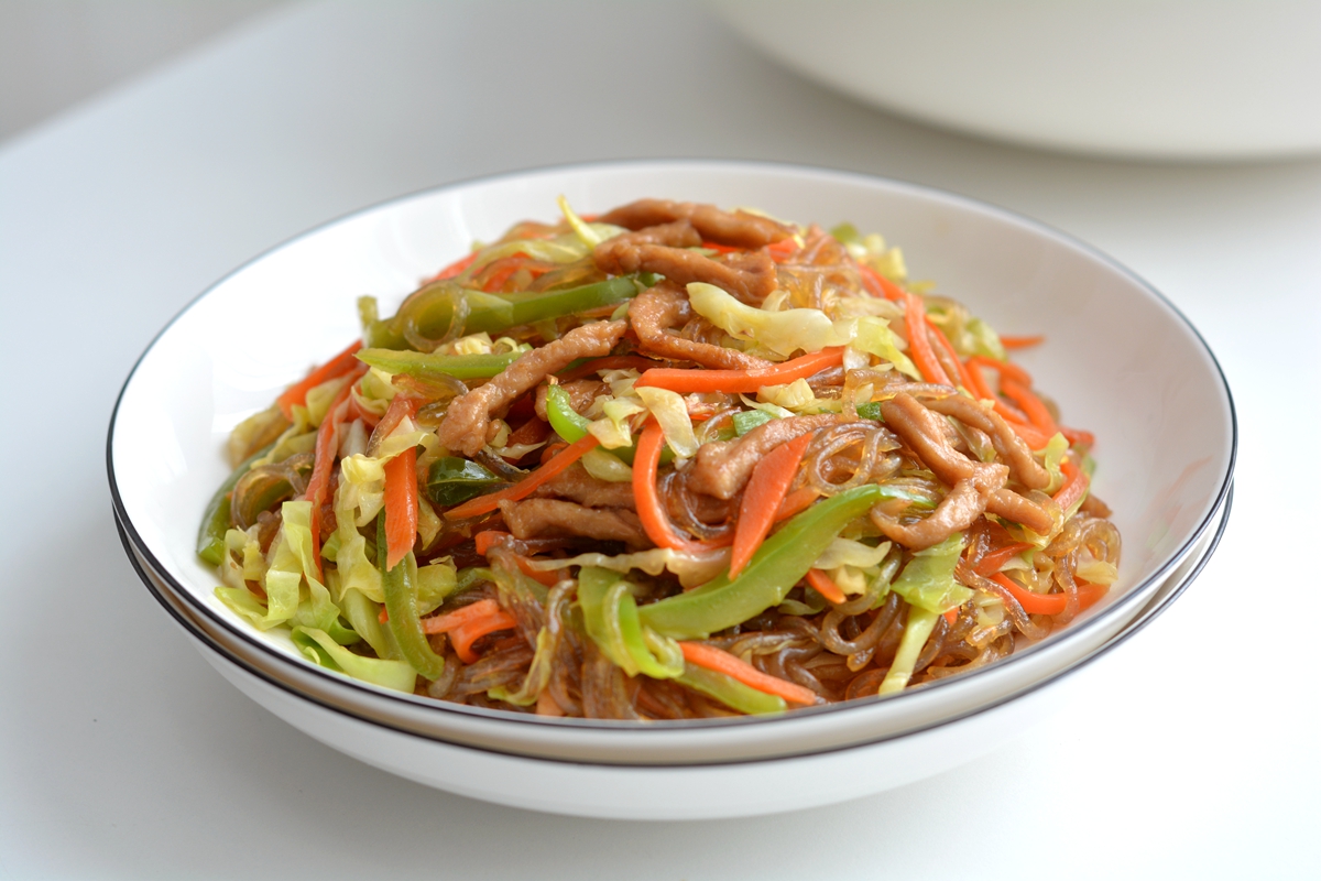 材料:瘦肉150克,圆白菜半颗,青椒1个,胡萝卜1根,粉条一碗,油适量,盐适量,酱油适量,淀粉1小勺,料酒少许,热水适量,香葱2棵