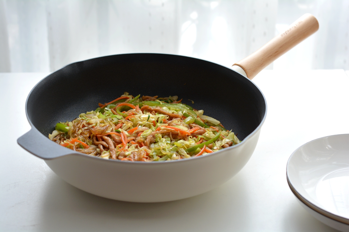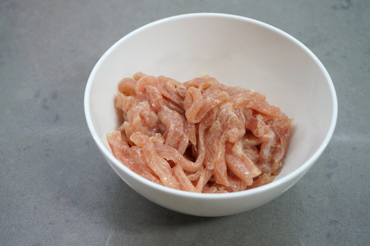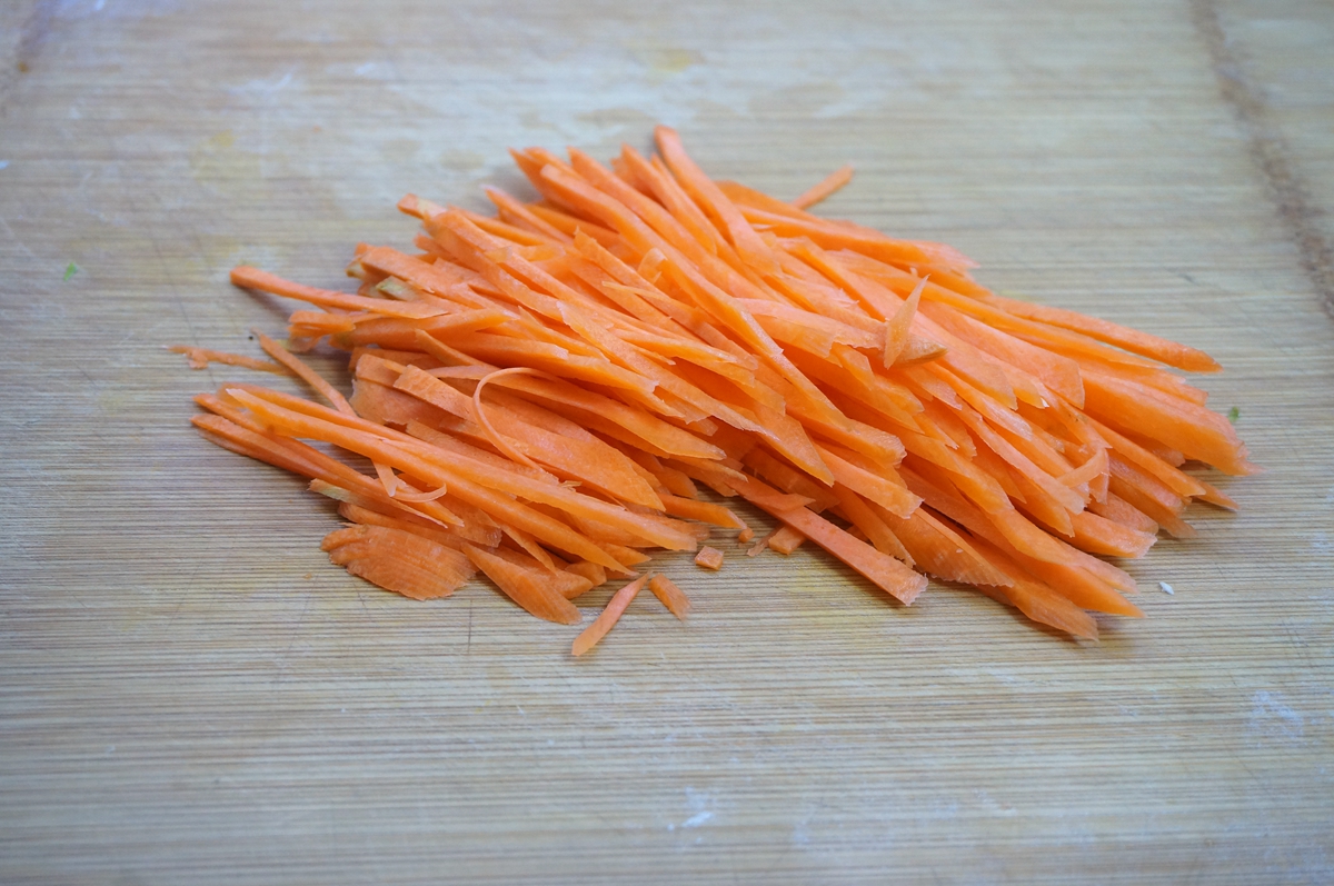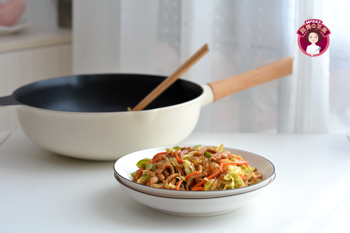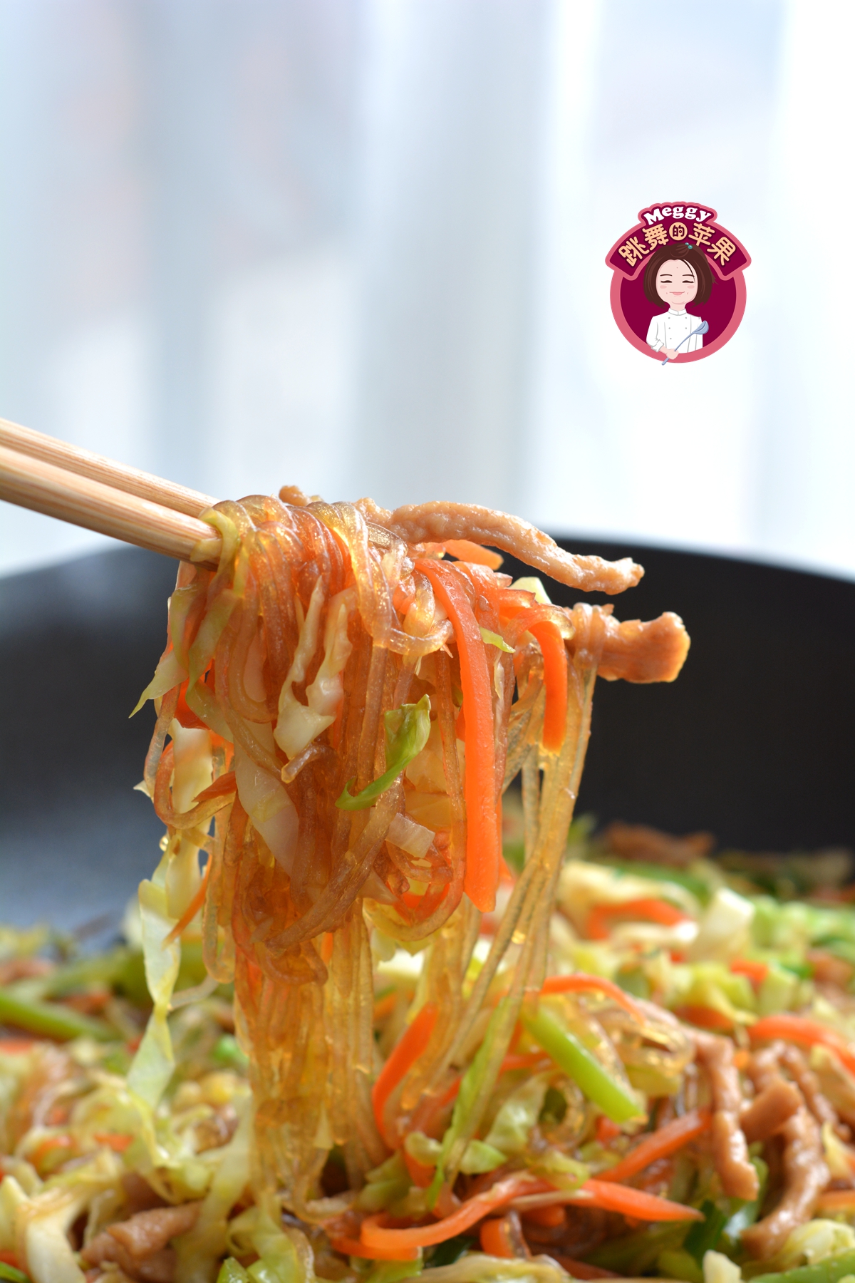 材料:瘦肉150克,圆白菜半颗,青椒1个,胡萝卜1根,粉条一碗,油适量,盐适量,酱油适量,淀粉1小勺,料酒少许,热水适量,香葱2棵