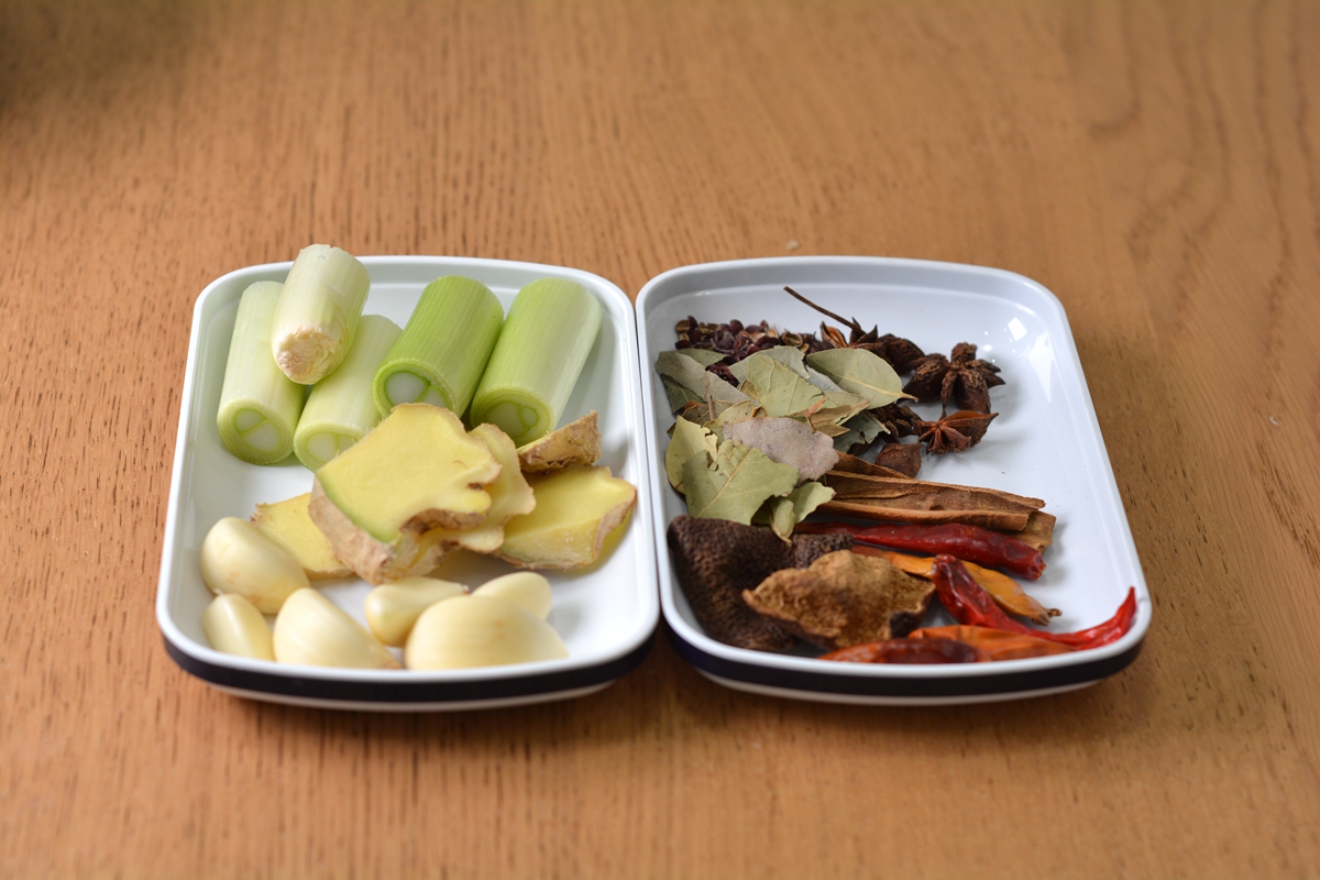 材料:肘子2个,老汤1大碗,大葱1棵,姜1块,大蒜1头,八角4颗,花椒1撮,香叶6片,桂皮1块,陈皮1块,干红辣椒5个,盐适量,老抽少许,生抽适量,水适量