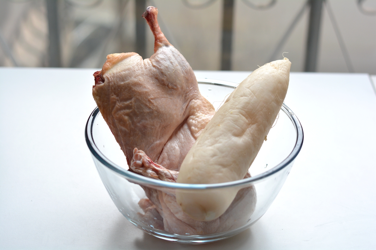 材料:酸萝卜1根,鸭子半只,大葱半棵,姜1块,盐适量,香葱少许,水适量