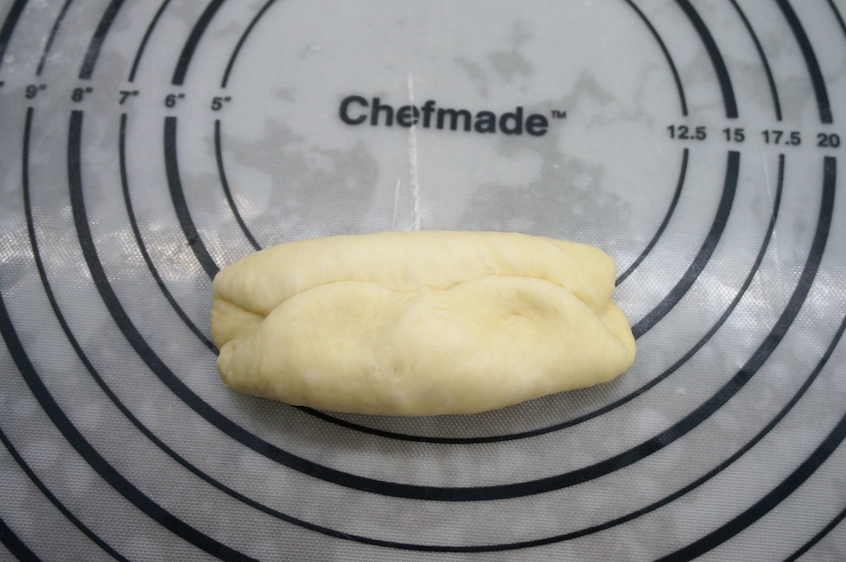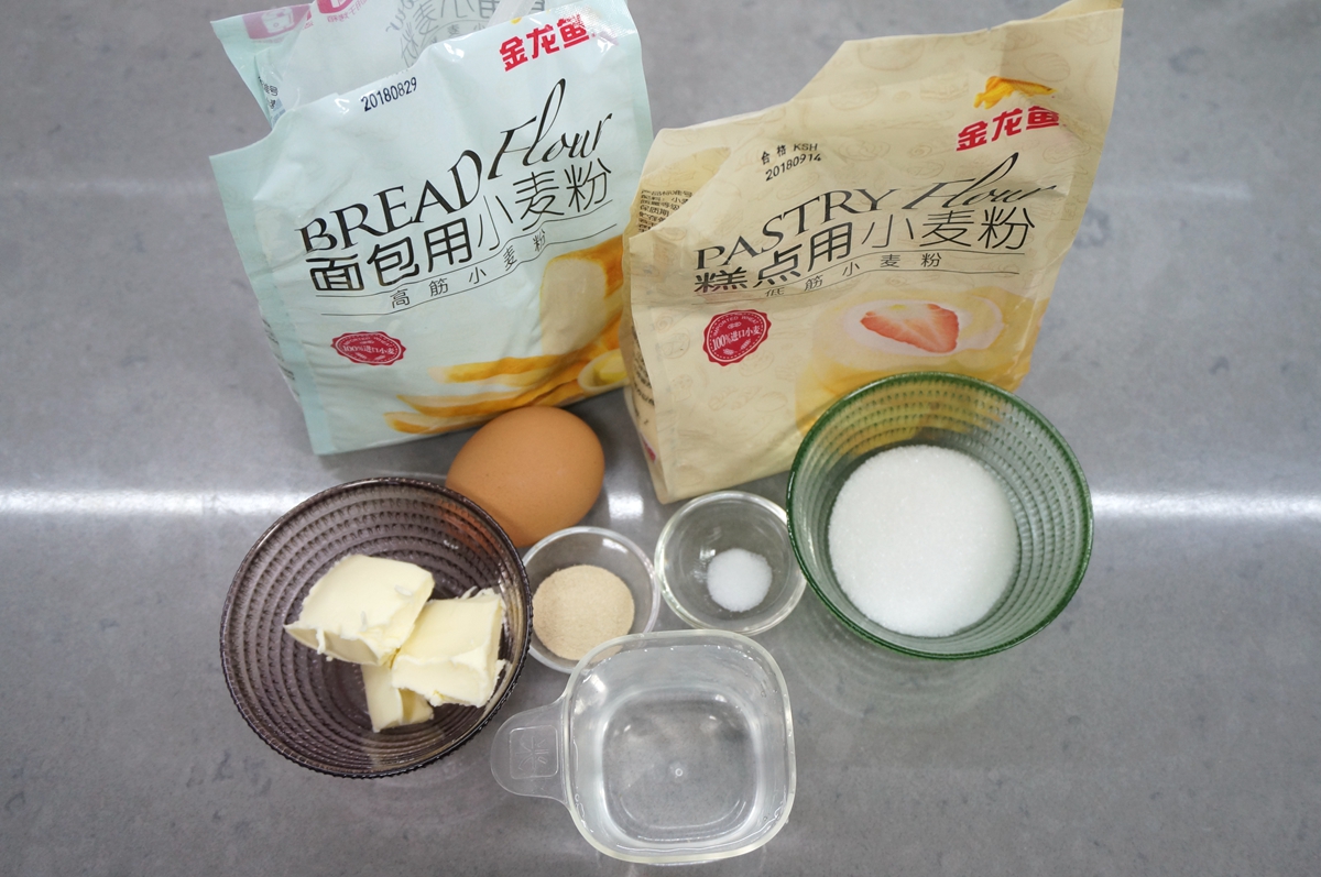 材料:高筋面粉230克,低筋面粉30克,鸡蛋55克,细白糖30克,盐1克,干酵母3克,凉水135克,黄油30克,表面刷蛋液少许,表面撒白芝麻少许