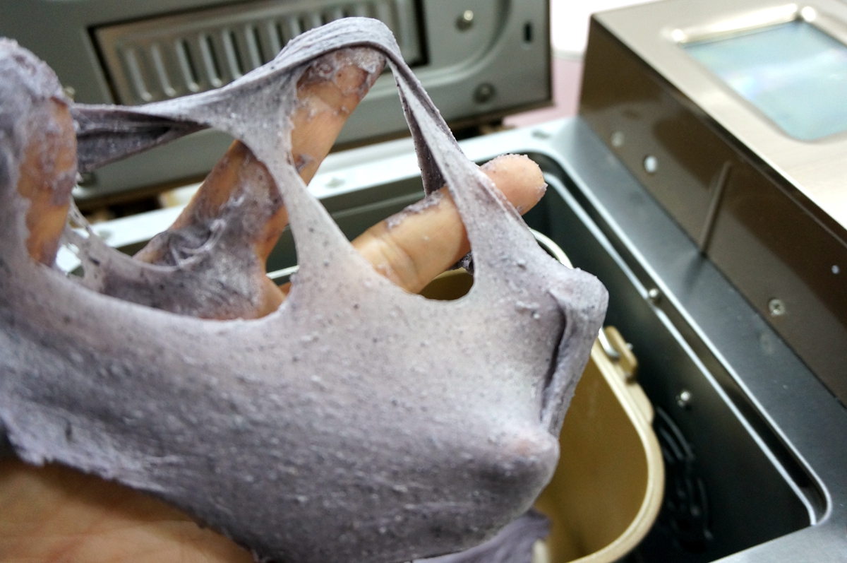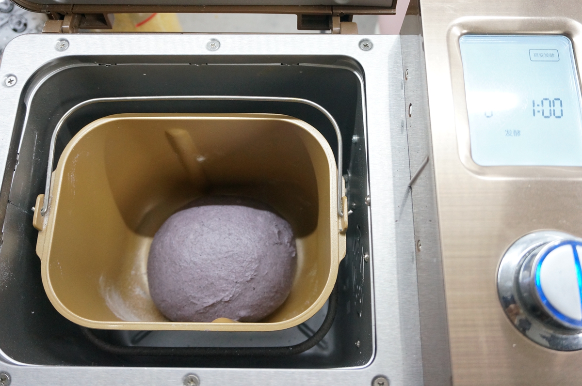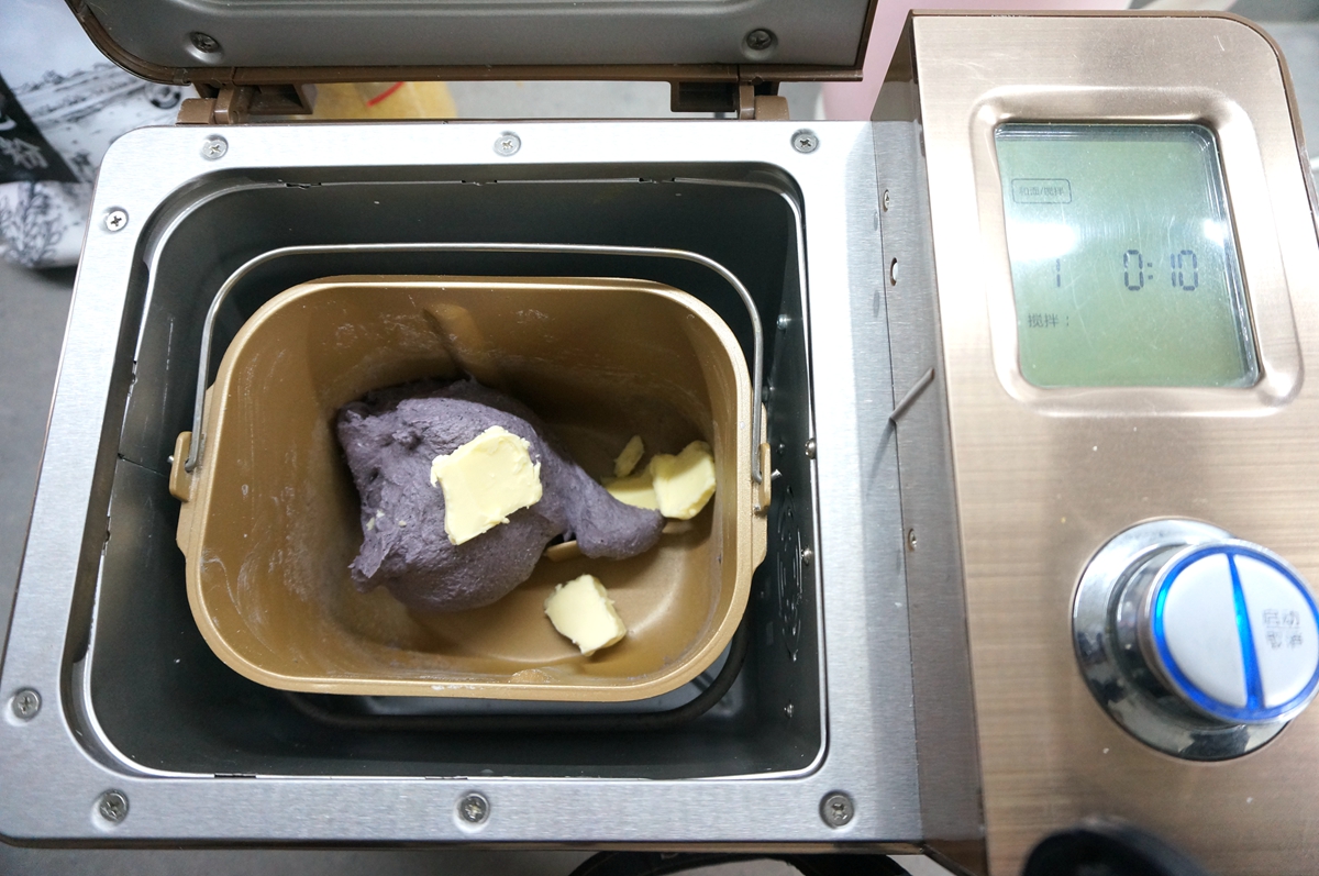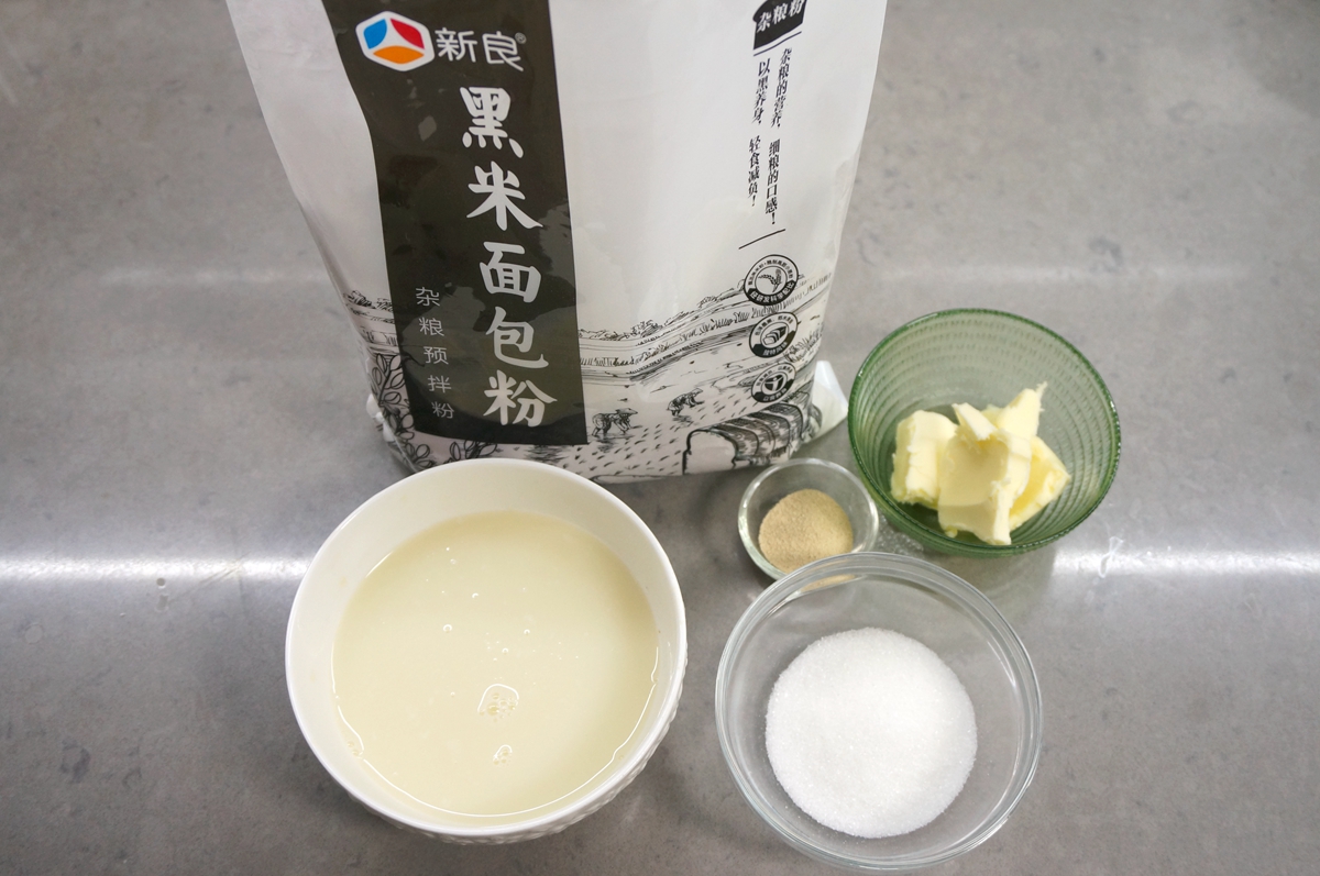 材料:新良黑米面包粉300克,自制浓稠豆浆220克(根据稀稠度来调整),白糖40克,干酵母3克,黄油35克,凉水适量(看豆浆稀稠度酌情使用),表面刷蛋液少许