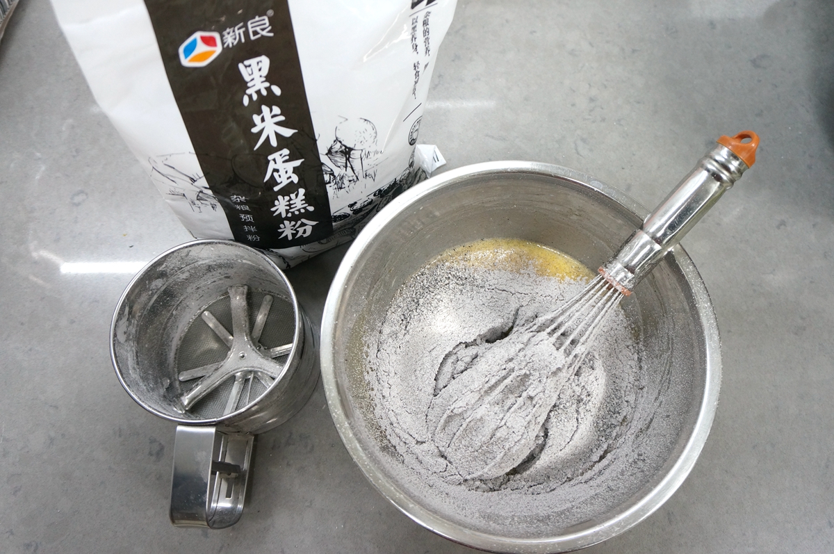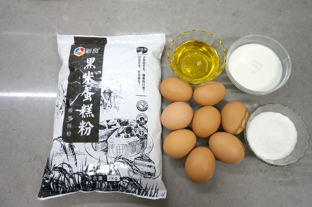 材料:65克带壳鸡蛋8个,新良黑米蛋糕粉160克,玉米油80克,牛奶90克,白糖110克