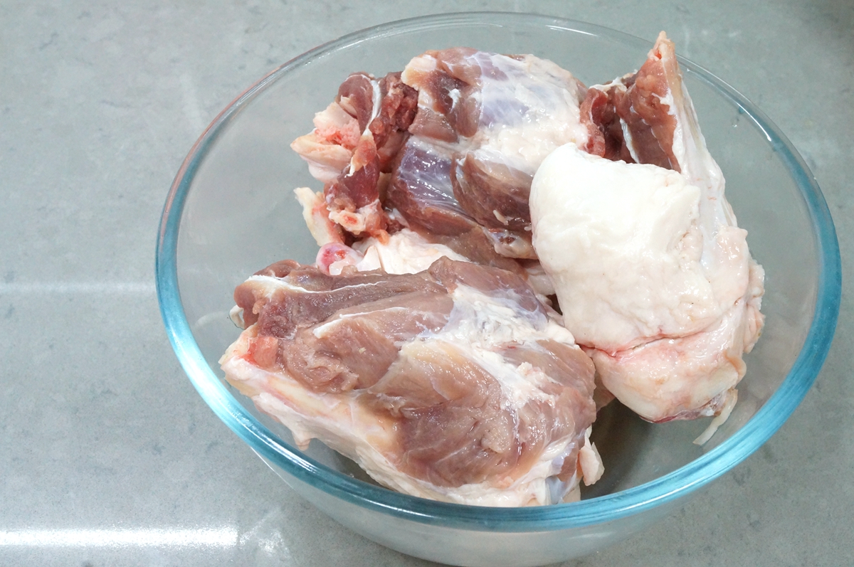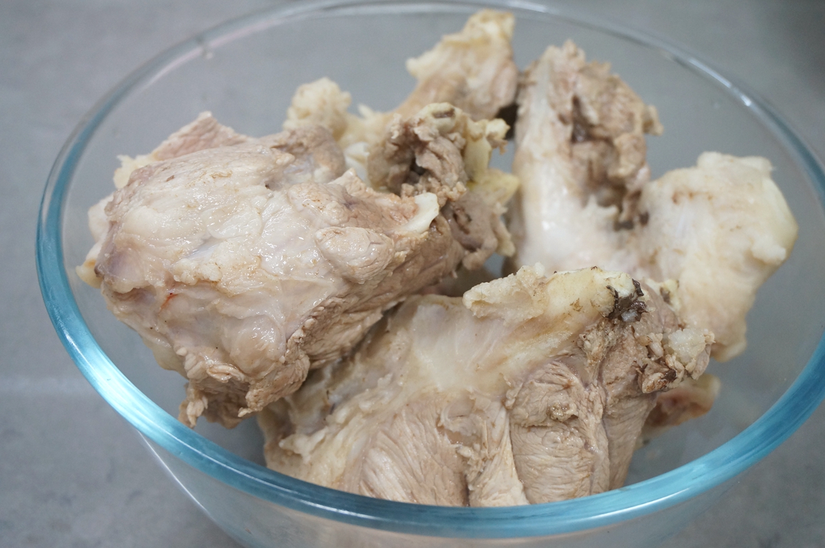 2. 看,剔下来的骨头是不是肉很多?让商家用大刀从中间砍断,不但放锅里煮时很方便,让人喜欢吮吸的骨髓也能露出来;肘子骨跟大棒骨都是猪腿上的,只是部位略有区别,您照我这个方法做,又吃肉又喝汤又省钱,何乐而不为?