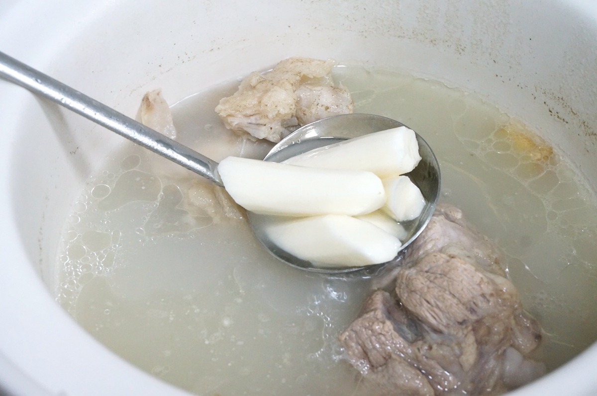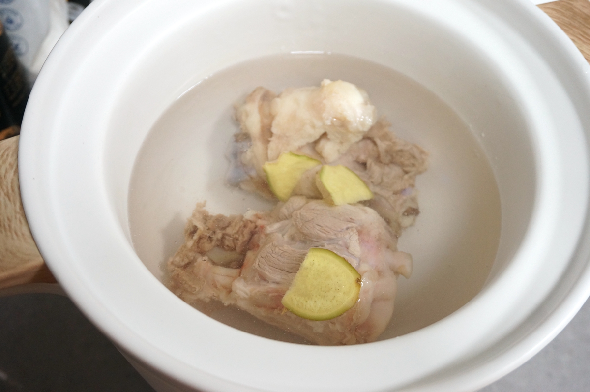 4. 两根肘子骨是4块,我只取两块来煲汤,剩下的两块第二天放其它材料煲,又是一道喝不腻的新汤;锅里倒适量热水,不要放凉水,一是费时间,二是刚焯水的肉如果受到凉水一激,蛋白质收缩,那肉吃起来就发紧不香了,另外用热水煮汤也能让汤煮得白白的;汤里放两片姜去腥就可以,以免调料太杂夺了肉骨头的香味;