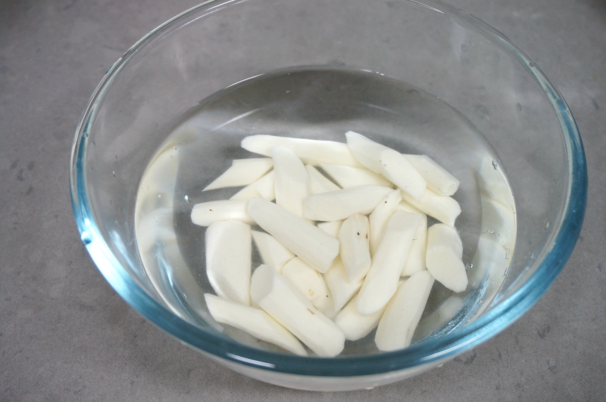 6. 煲汤时来处理一下山药;我选的铁棍山药,有健脾补气一说,多吃身体好,而且秋冬季节吃还有润肺的功能;山药上的粘液沾到手上会痒痒的,可以一手紧紧攥住一端,另一手刮皮,最后损失只是那2、3公分的山药,冲水切段,浸泡在凉水中防氧化变黑;