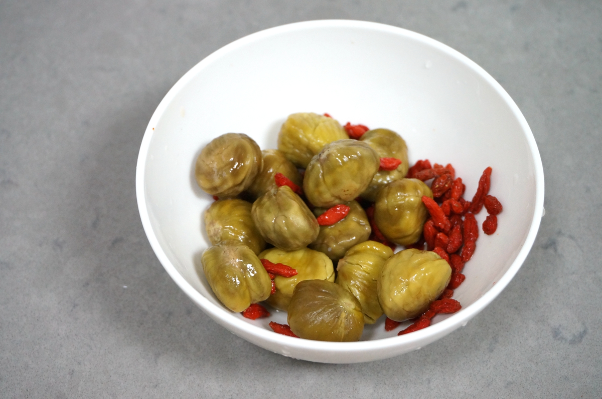 7. 栗子是提前剥好的,表面用剪刀剪一刀,入平底锅中盖盖子焖3-5分钟,放凉至手能接受的温度时轻松剥皮,一顿吃不了可以入保鲜袋冰箱冷冻保存,用时化冻即可,枸杞冲洗一下;