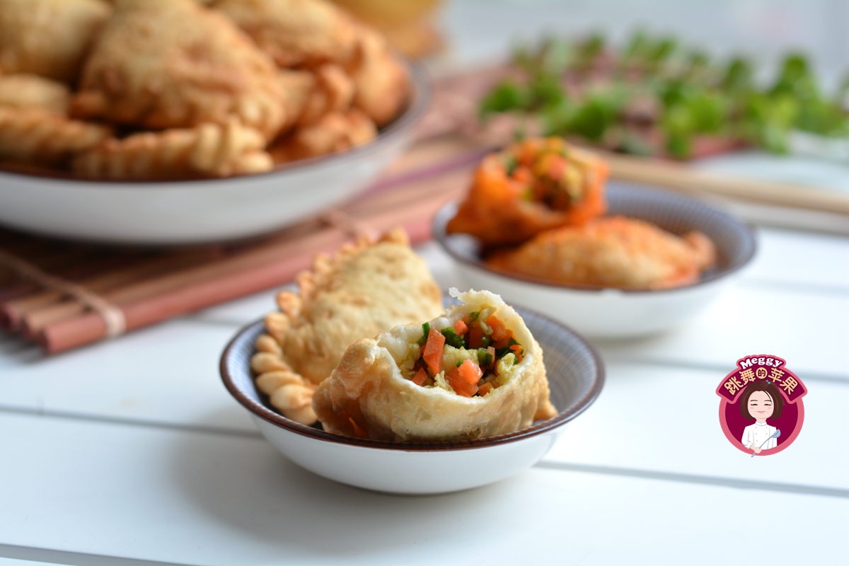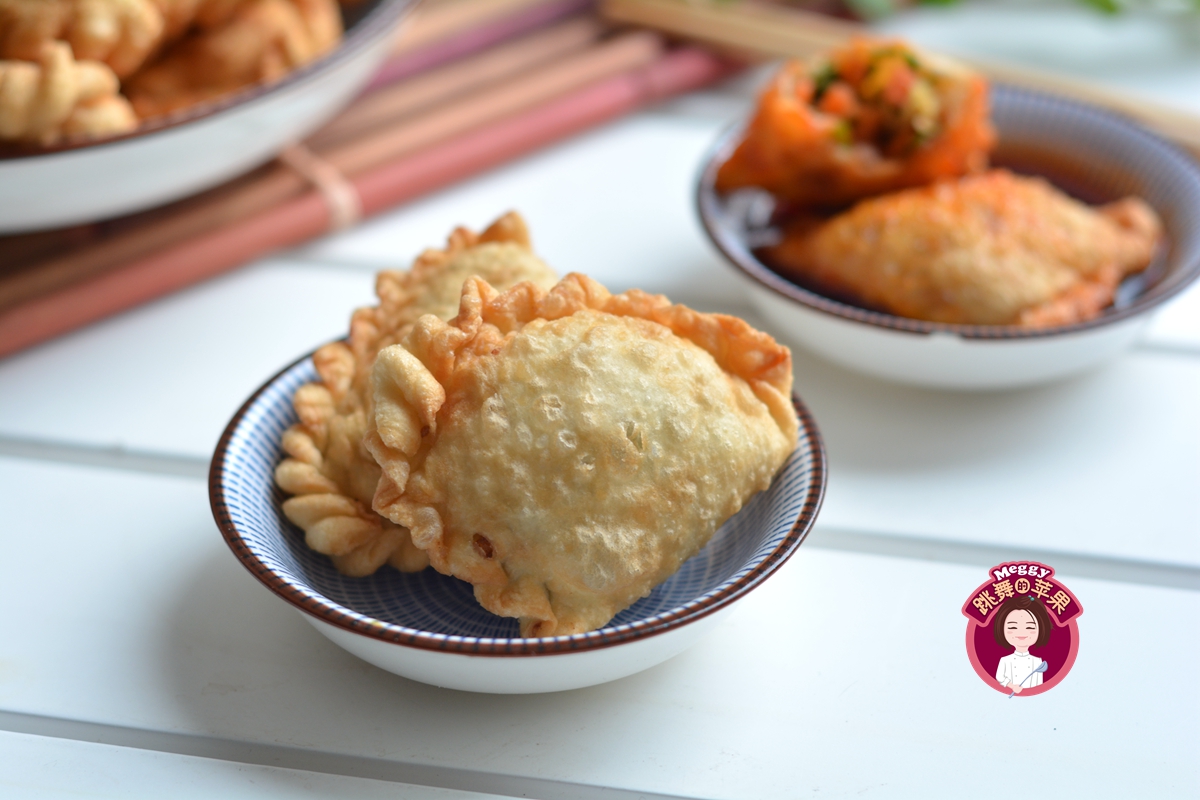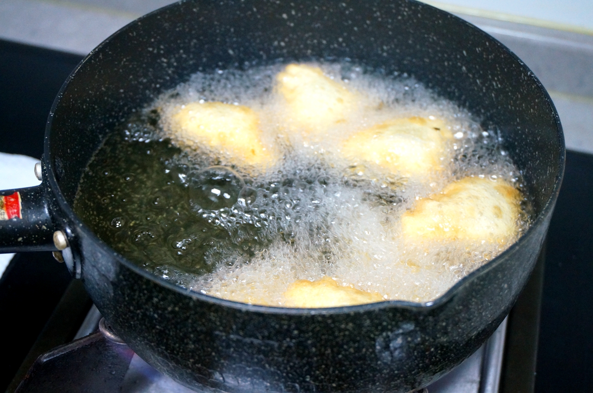 油锅加热,竹筷子入油锅后周围有小气泡时就可以把几个盒子入油锅中炸至表面金黄,因为馅是素的,所以很快就熟了。想要表皮更加酥脆,可以再复炸一遍。