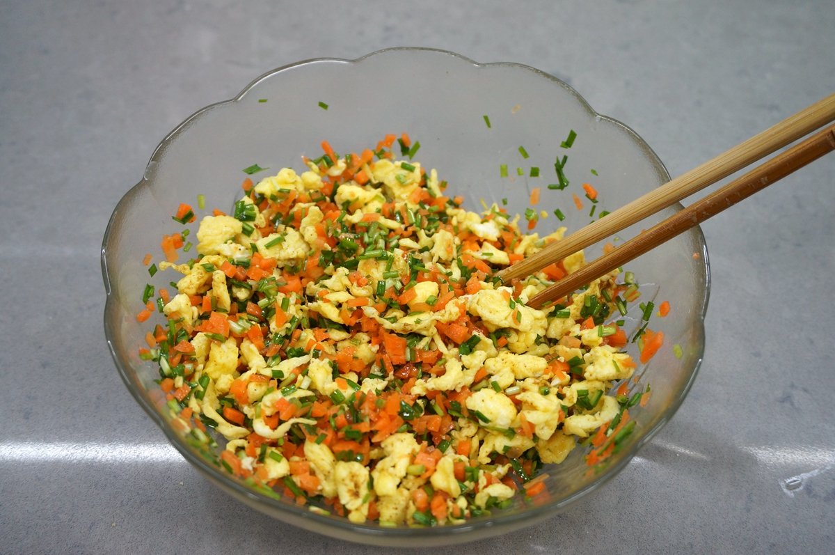 肉馅材料:鸡蛋2个,韭菜1把,胡萝卜1根,植物油适量,盐适量,十三香2克