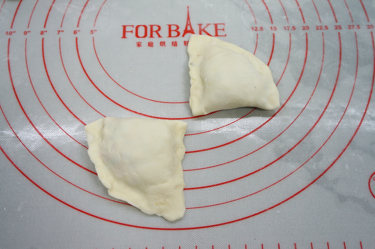 上下对折,边缘按压严实,可以用餐叉压出花边,也可以用手捏出花边,整个盒子呈三角形状,小巧可爱;