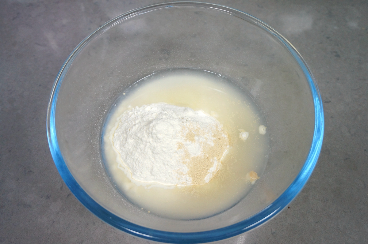 1. 面粉、干酵母、白糖、温水同入一盆,水量根据面粉的吸水率和喜欢的口感来调整;水量是面粉量的50-65%都可以;水多一些,成品的千层糕会柔软,水少一些口感便干一些,但是定型漂亮;白糖可以给酵母提供养份,更好地发酵;