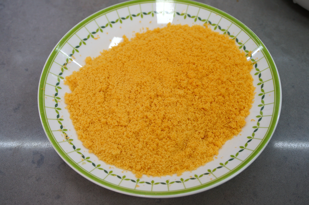4. 将咸蛋黄压扁,用筛子过筛,这样铺撒的时候会更加均匀,薄厚一致;