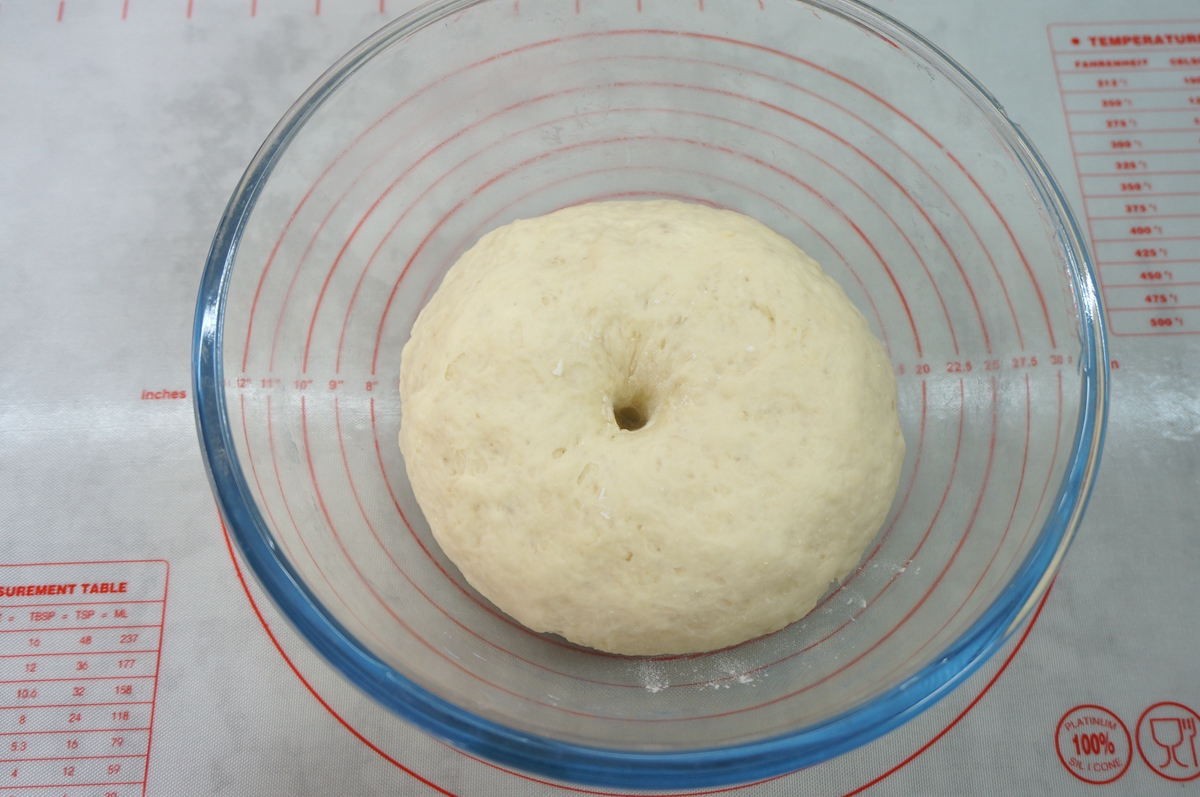 5. 发好的面团是原来的2倍大小,手指蘸面粉在面团顶部戳个洞,不塌陷不回缩,发酵成功;如果掀开面团,底部的组织呈现细密的小气孔;
