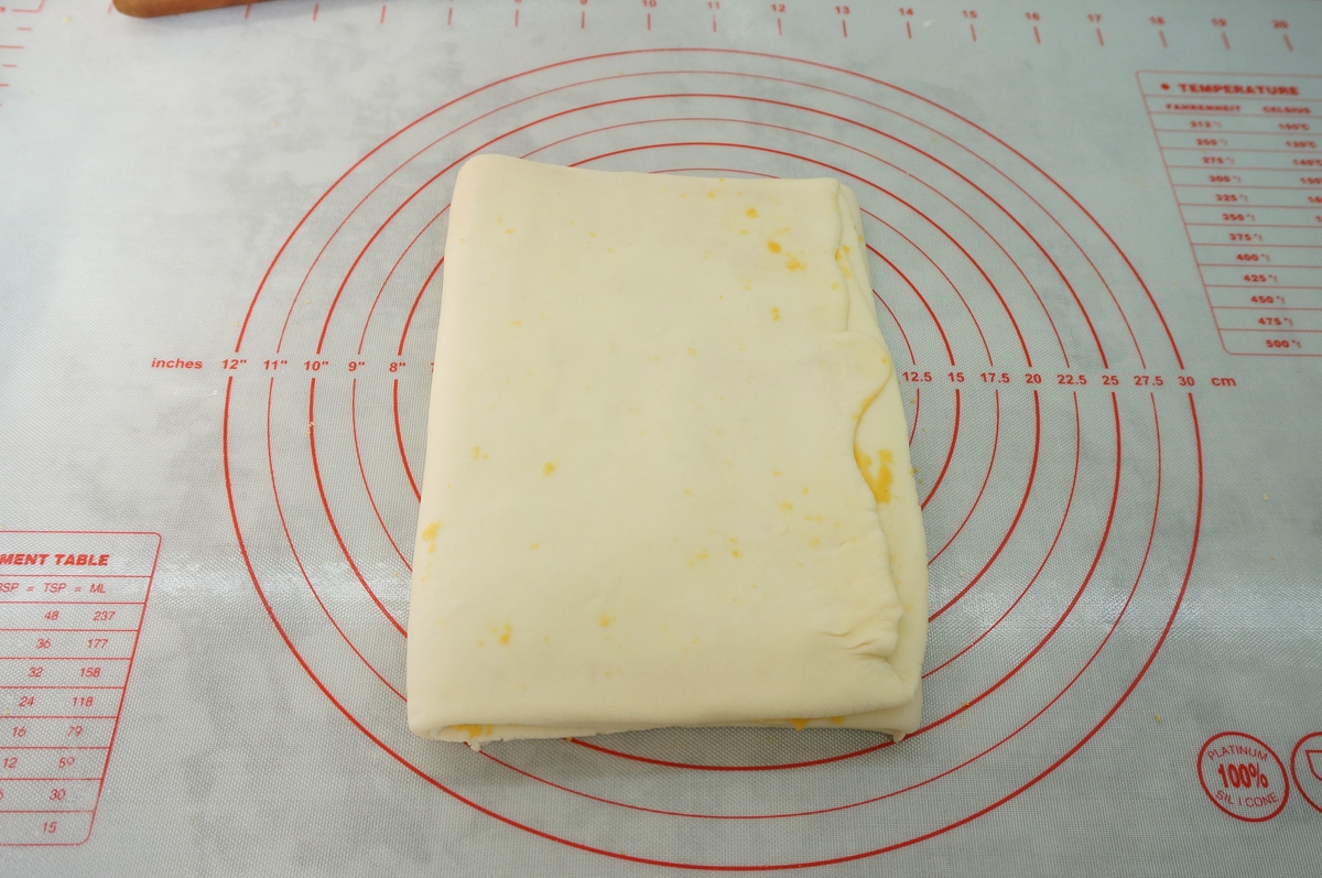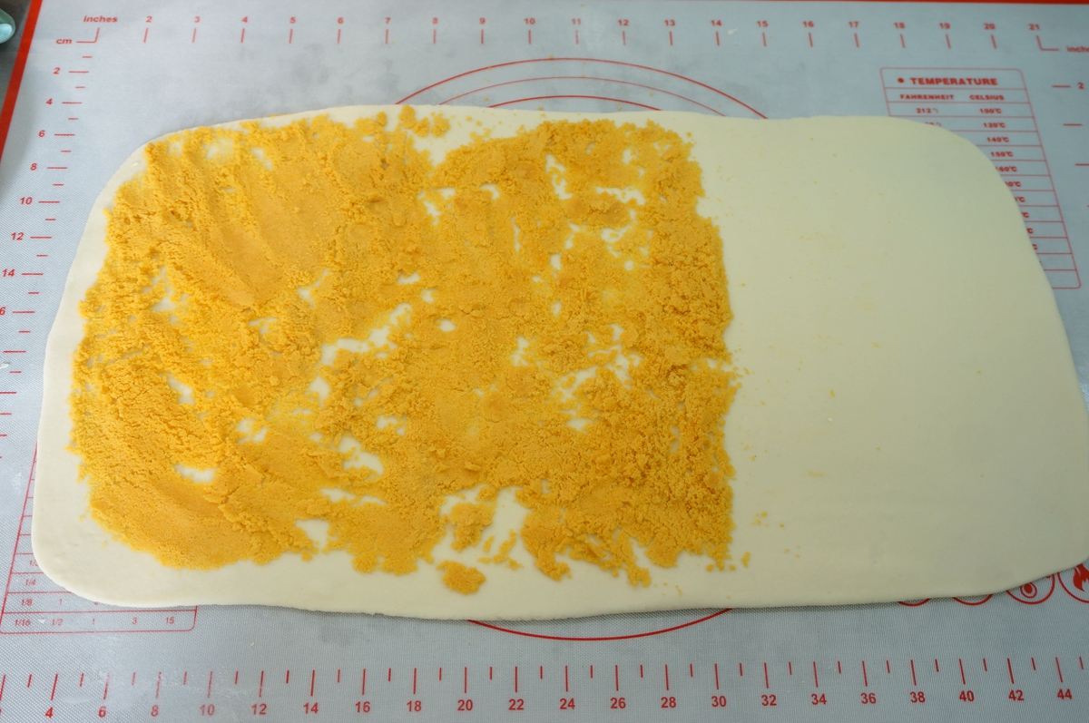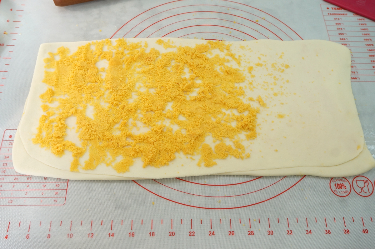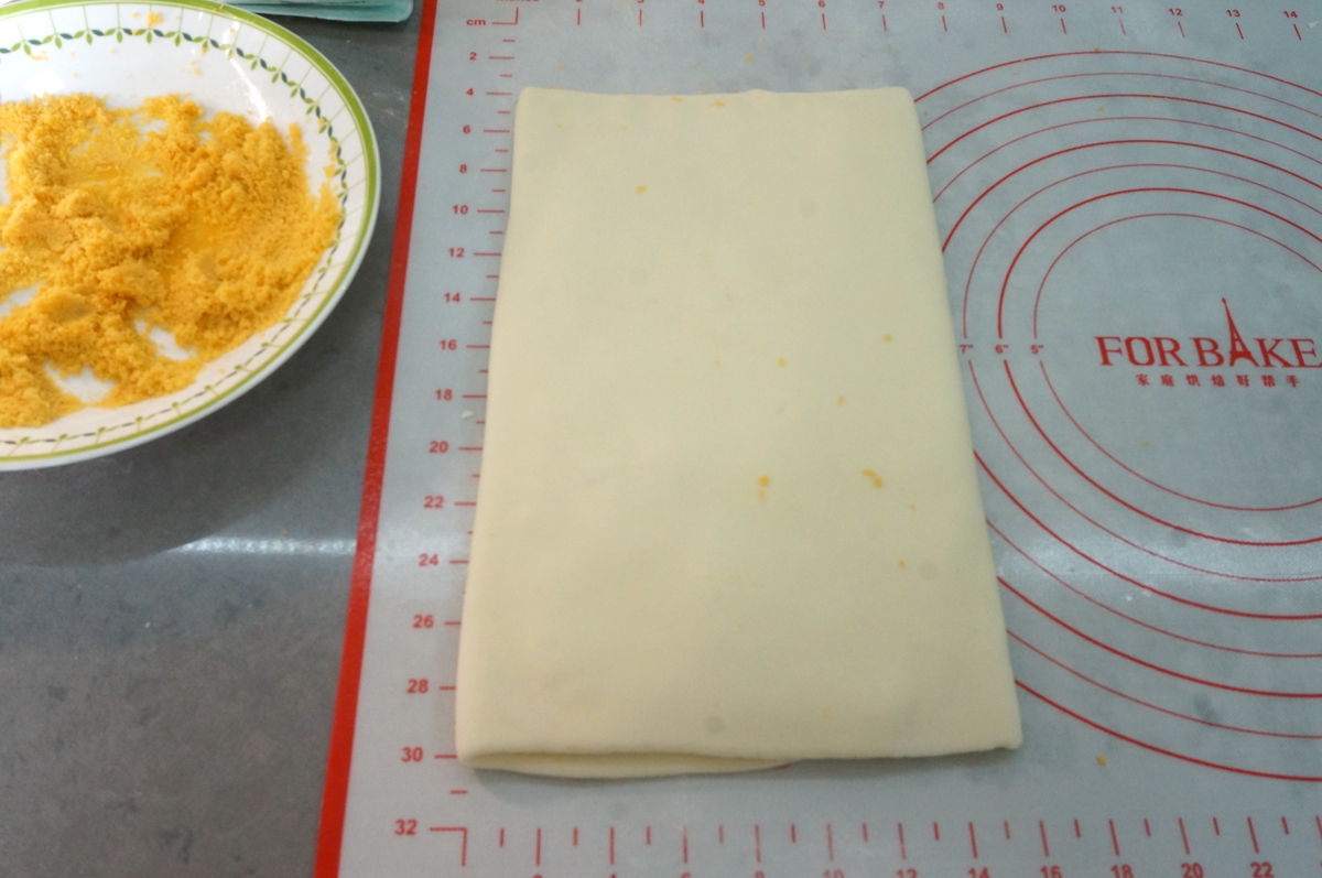 9. 将面饼90度转向,用擀面杖擀成长方形,大小比第一次略小一些;将剩下的蛋黄的2/3均匀铺撒在面皮上,也是只铺2/3;