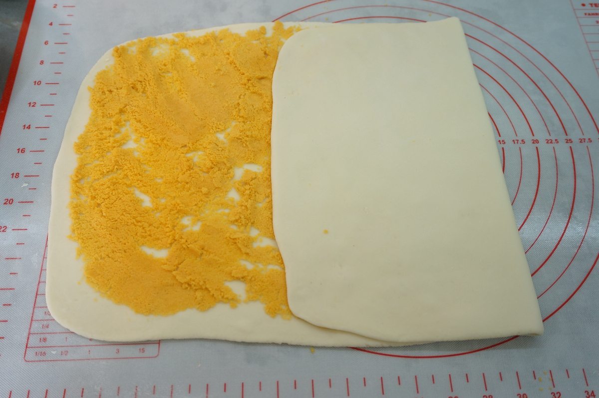 6. 将面团取出放在揉面垫上,抓两把面粉揉进面团,直到面团里的气孔消失,组织细密;擀成长方形大片,把2/3的咸蛋黄铺撒在2/3的面片上,边缘留空白;