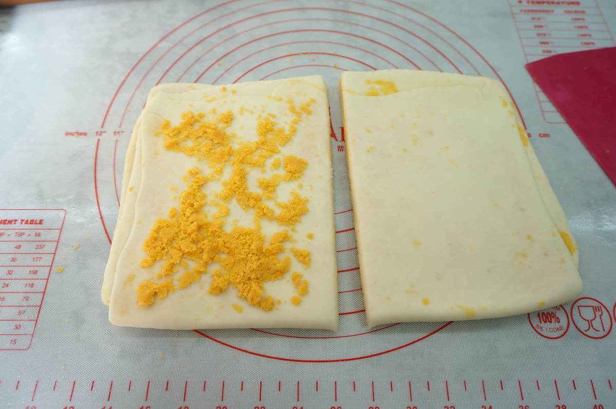 11. 将面饼再次90度转向,用擀面杖略微擀一擀,然后分成两等分,将剩下的蛋黄撒在在其中一份的表面上;