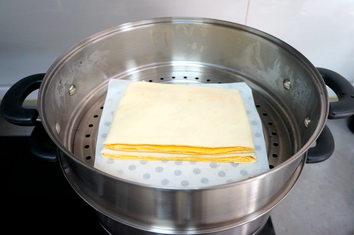 12. 将两份面饼摞在一起,放在铺了油纸的蒸锅里,油纸用打湿的屉布代替也是可以的;盖上盖子饧20分钟;