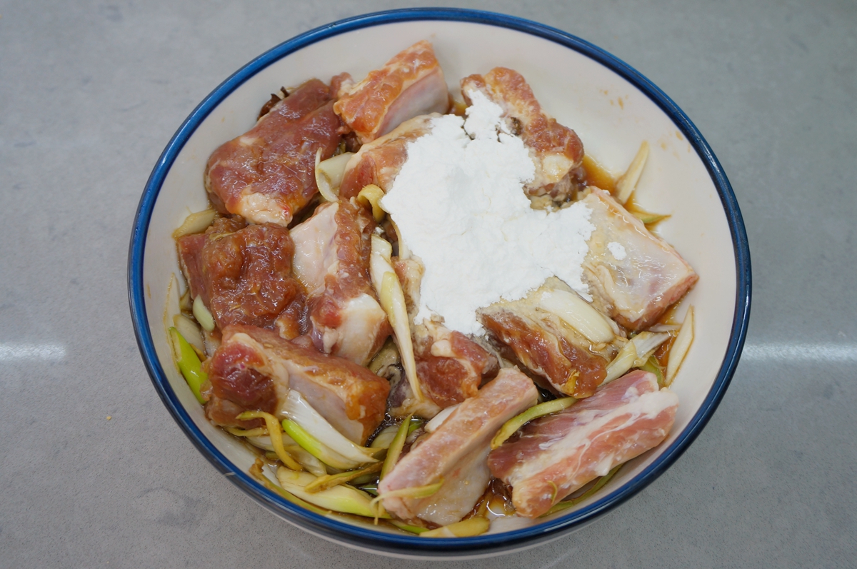 材料:小排骨600克,生抽30克,蚝油20克,料酒20克,盐少许,白糖15克,大葱半棵,姜1块,八角1颗,玉米淀粉30克,红辣椒1根,香葱2棵