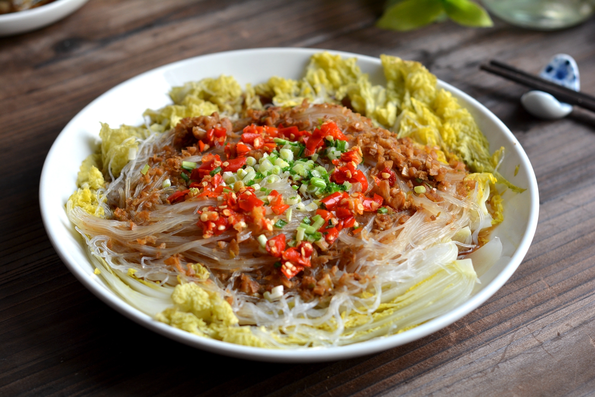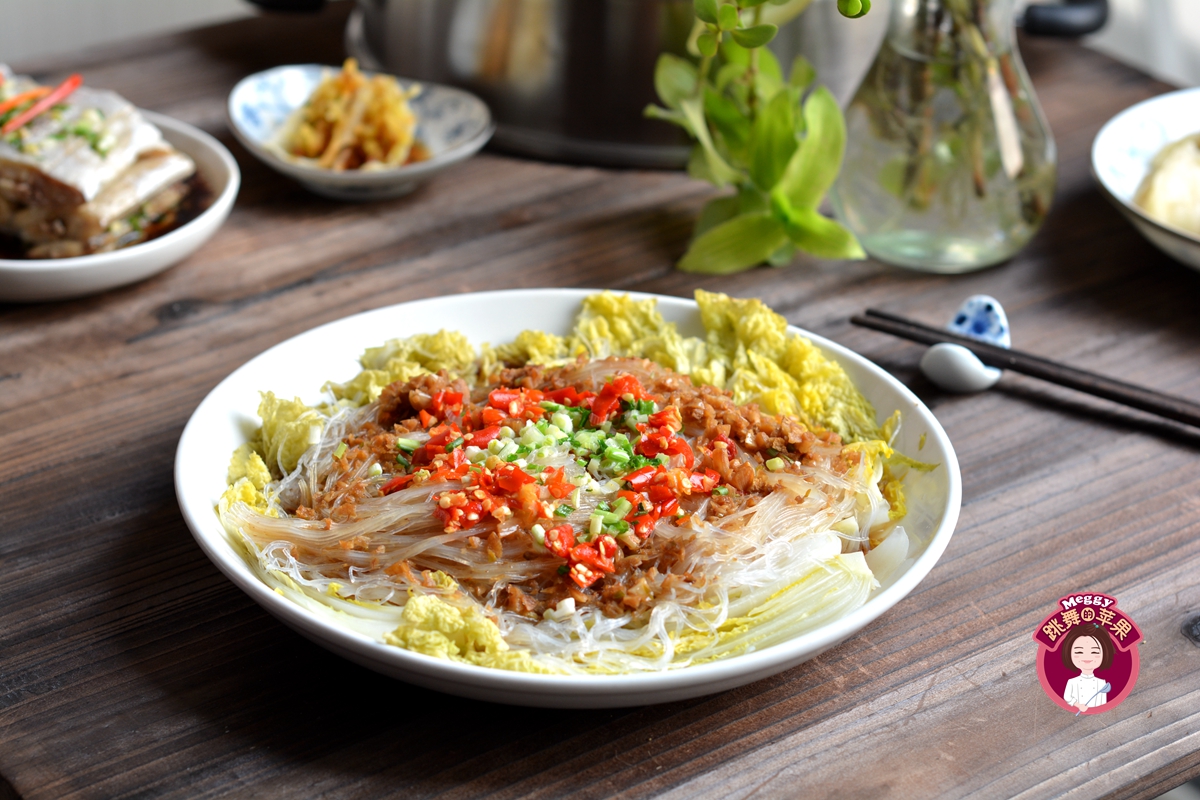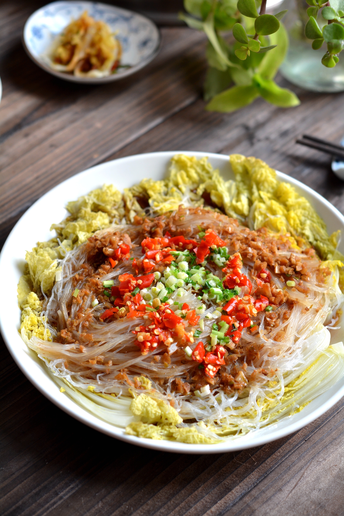 娃娃菜无需焯水,直接生着去蒸就可蒸软蒸熟;粉丝一定要提前温水泡软再蒸;料汁可以省略,直接掉生抽或者蒸鱼豉油;撒上剁椒香葱再泼一点儿热油,菜会更香;料汁有浓郁的蒜香,淋在菜和粉丝上非常入味。粉丝是淀粉做的,所以吃上这一盘主食可以减量。