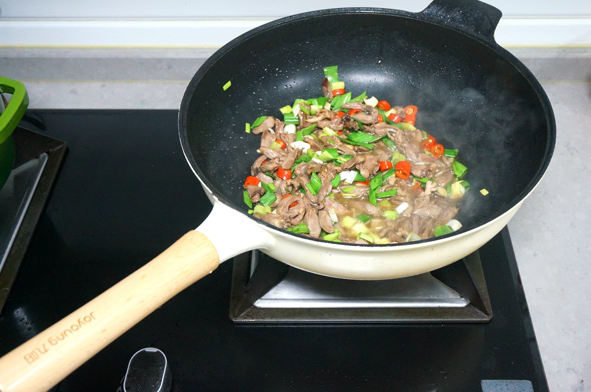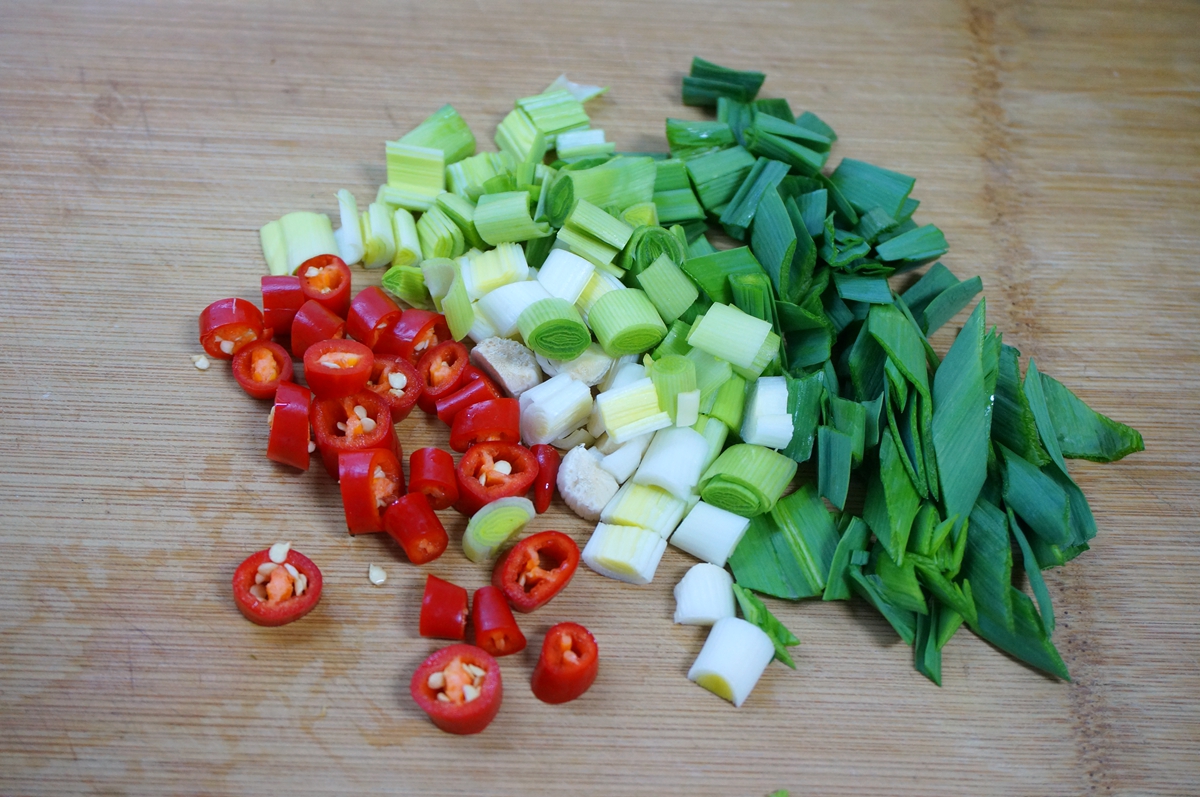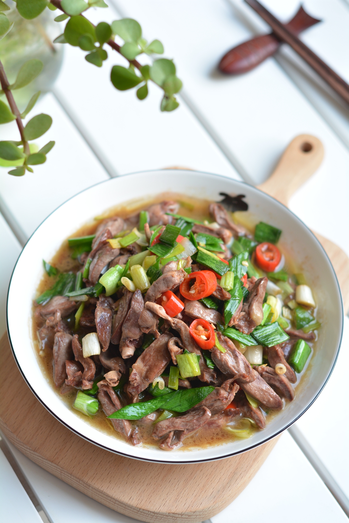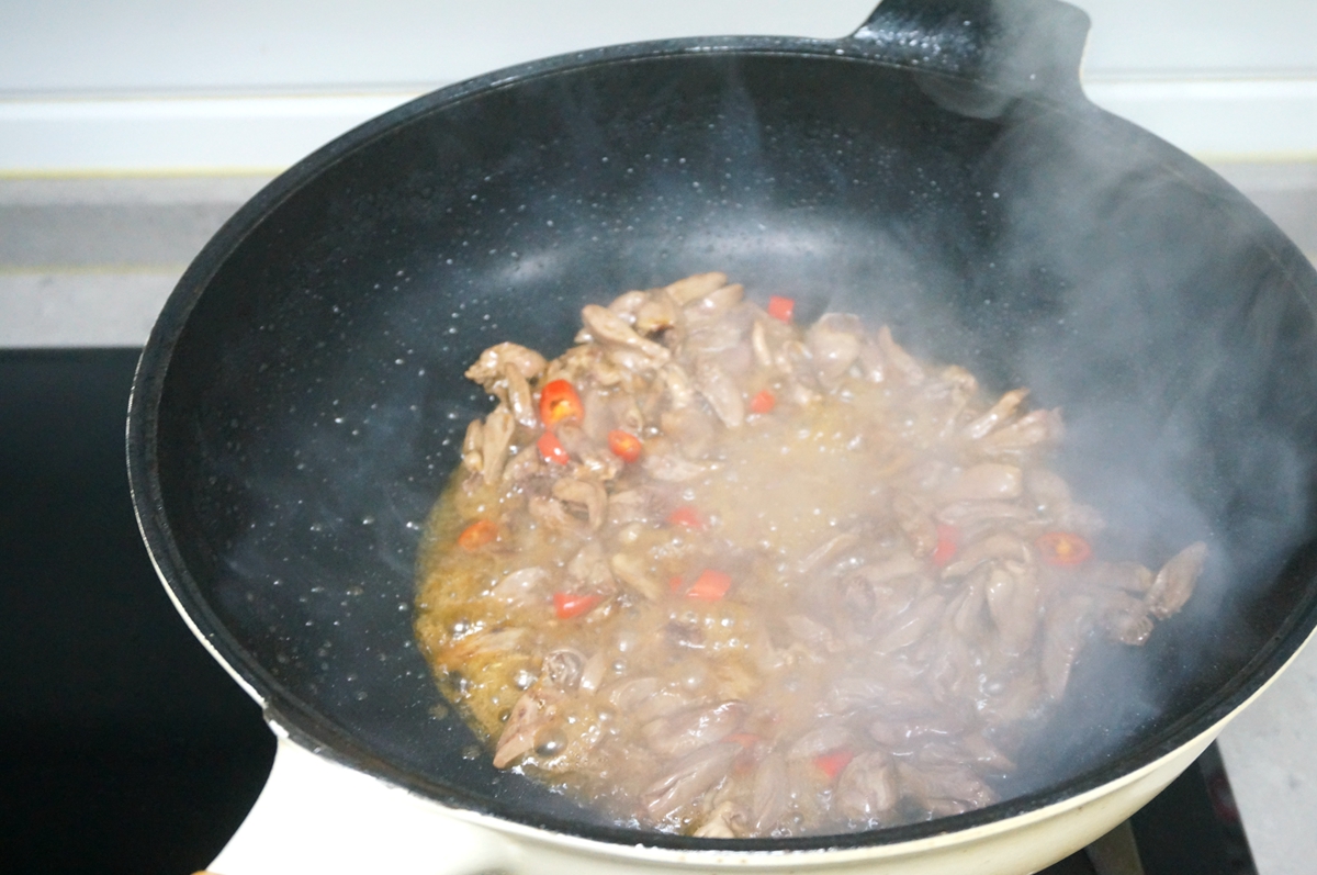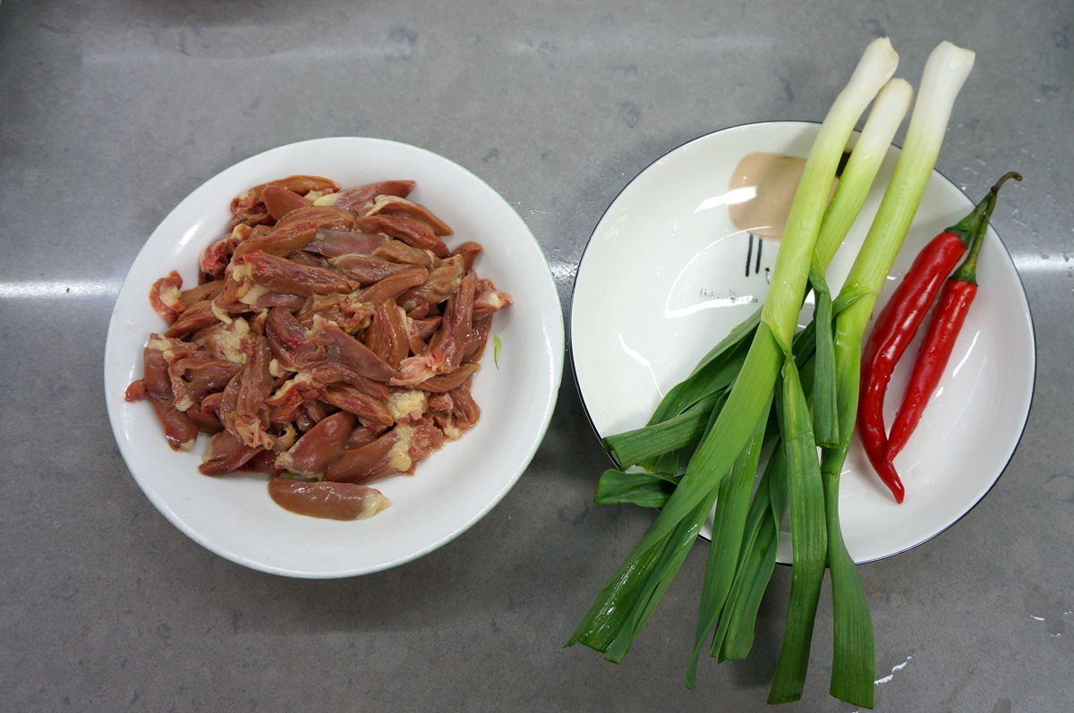 材料:鸡心1盘,青蒜3棵,红辣椒2个,油适量,酱油适量,盐少许,生抽少许,料酒少许