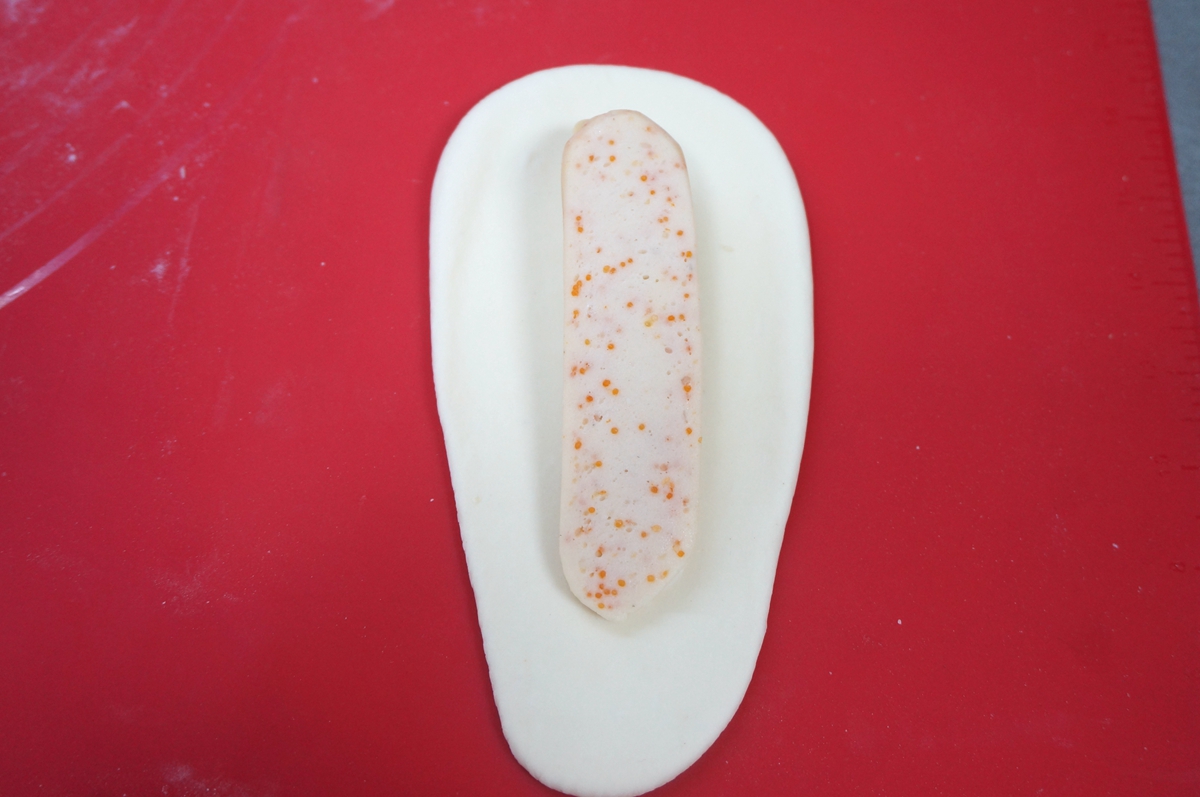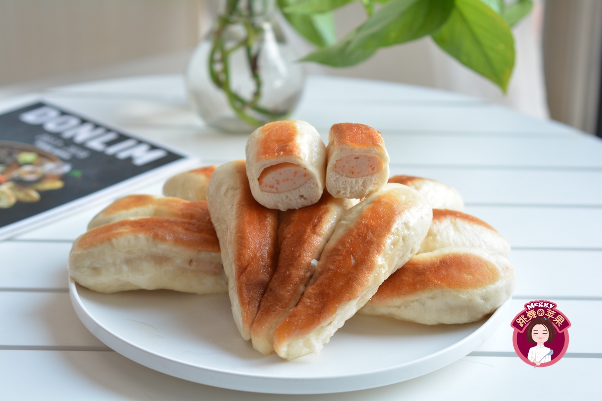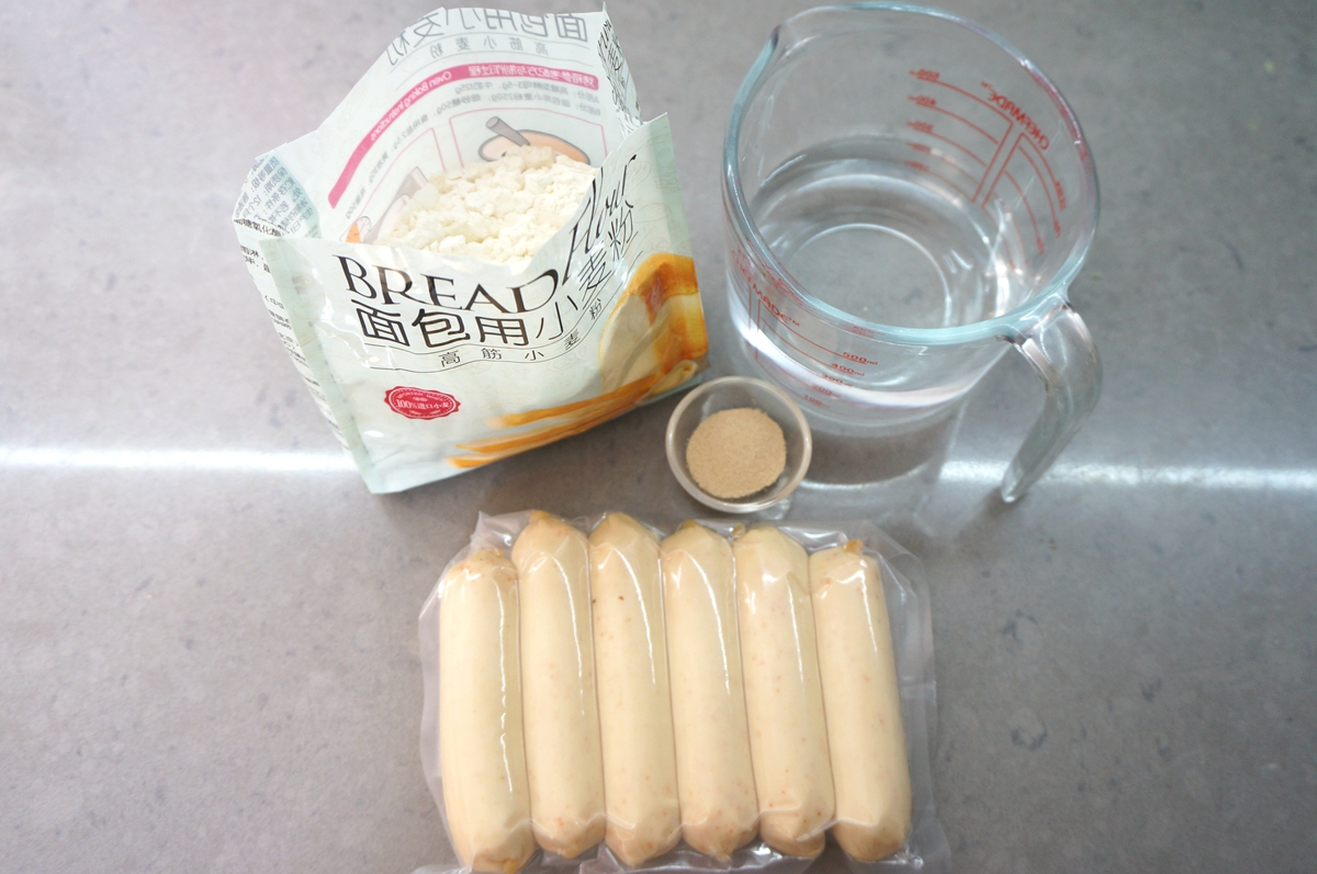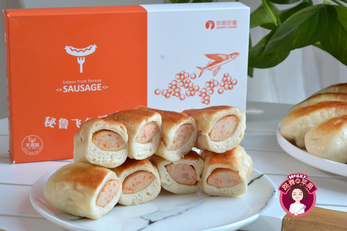 材料:高筋面粉300克,干酵母3克,温水200克,珍妮珍馐秘鲁飞鱼籽肠6根,油适量,热水半碗