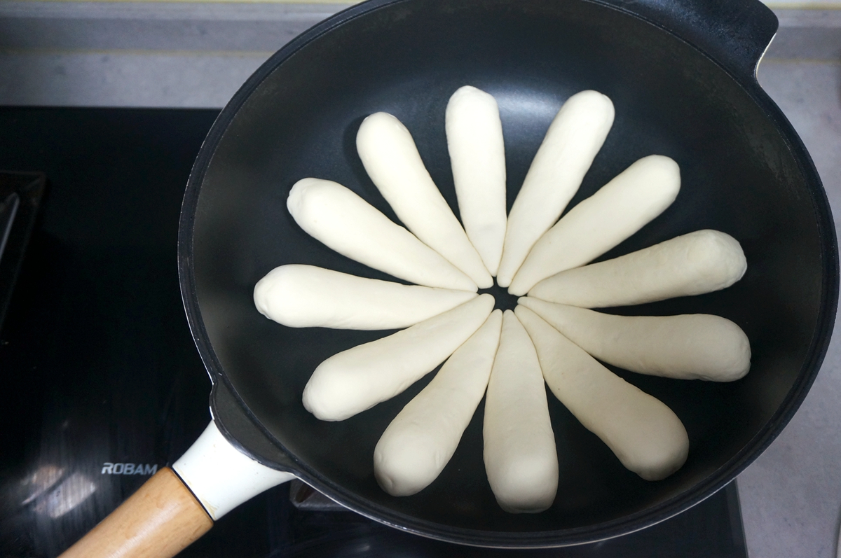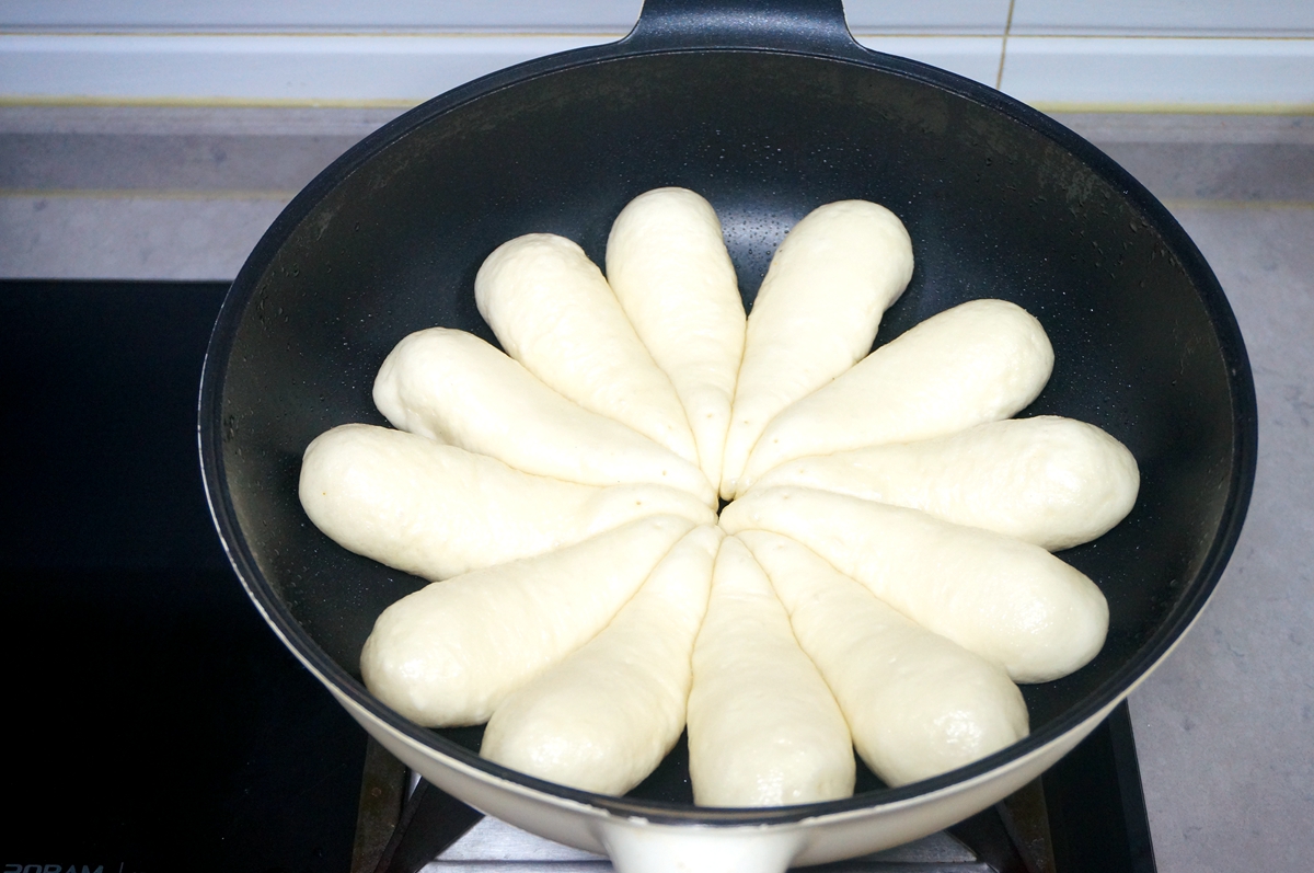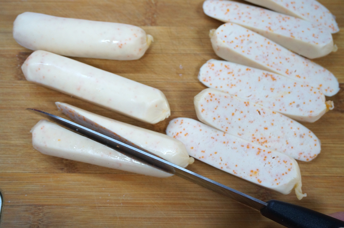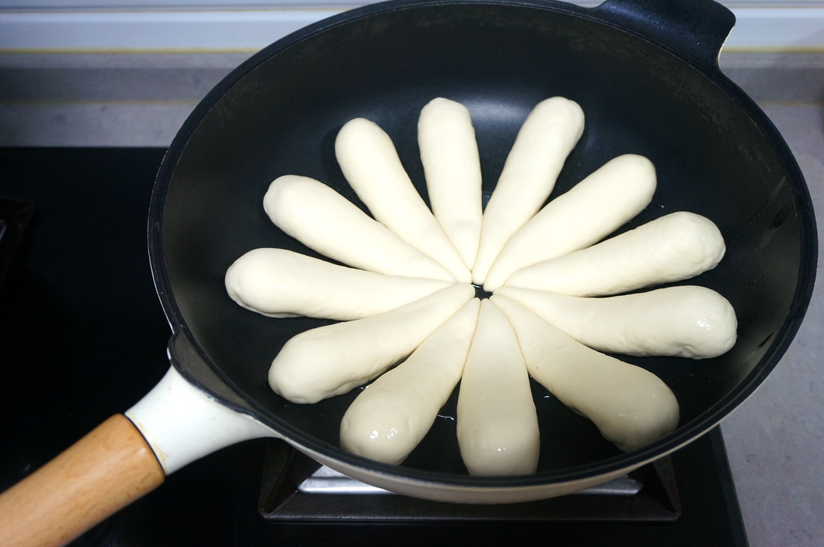馒头是我们北方人的主食之一,平时都是蒸着吃的,那天我就想,既然饺子、包子、花饼都能煎着吃,那咱这个馒头也可以煎着吃啦!想到就做,生煎馒头来当晚饭不是很好嘛!正好有一盒秘鲁飞鱼籽肠,如果煎着吃,就失去清香的鲜味,而且还油腻。最大限度地保留住它的香味和营养就是把它裹进面团中,什么都不损失啦!突然间,我为自己的这个完美想法得意了一下!