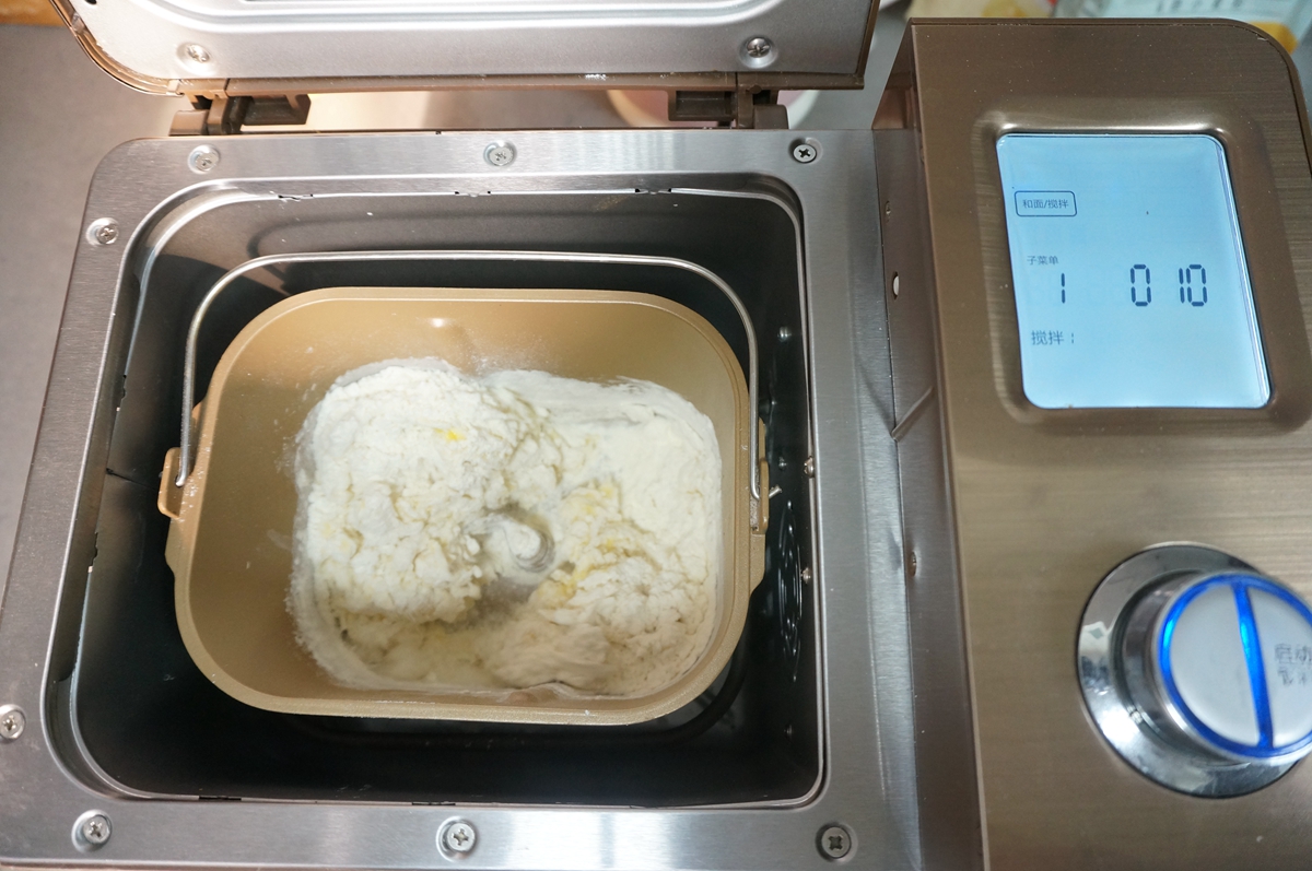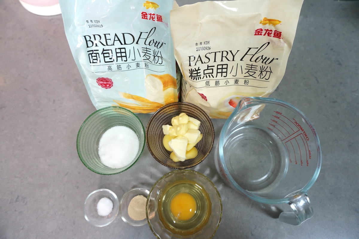 材料:金龙鱼高筋小麦粉250克,金龙鱼低筋小麦粉50克,干酵母3克,鸡蛋液50克,白糖30克,盐1克,清水130克,黄油30克,表面刷蛋液少许,表面筛糖粉少许
