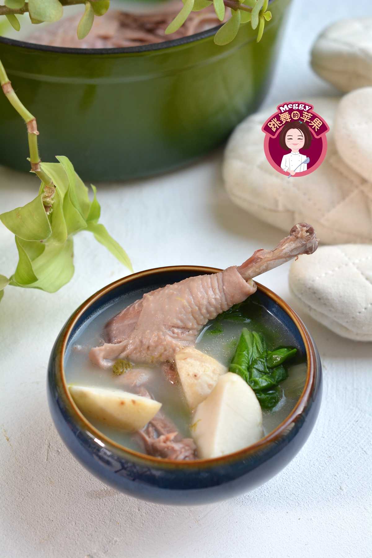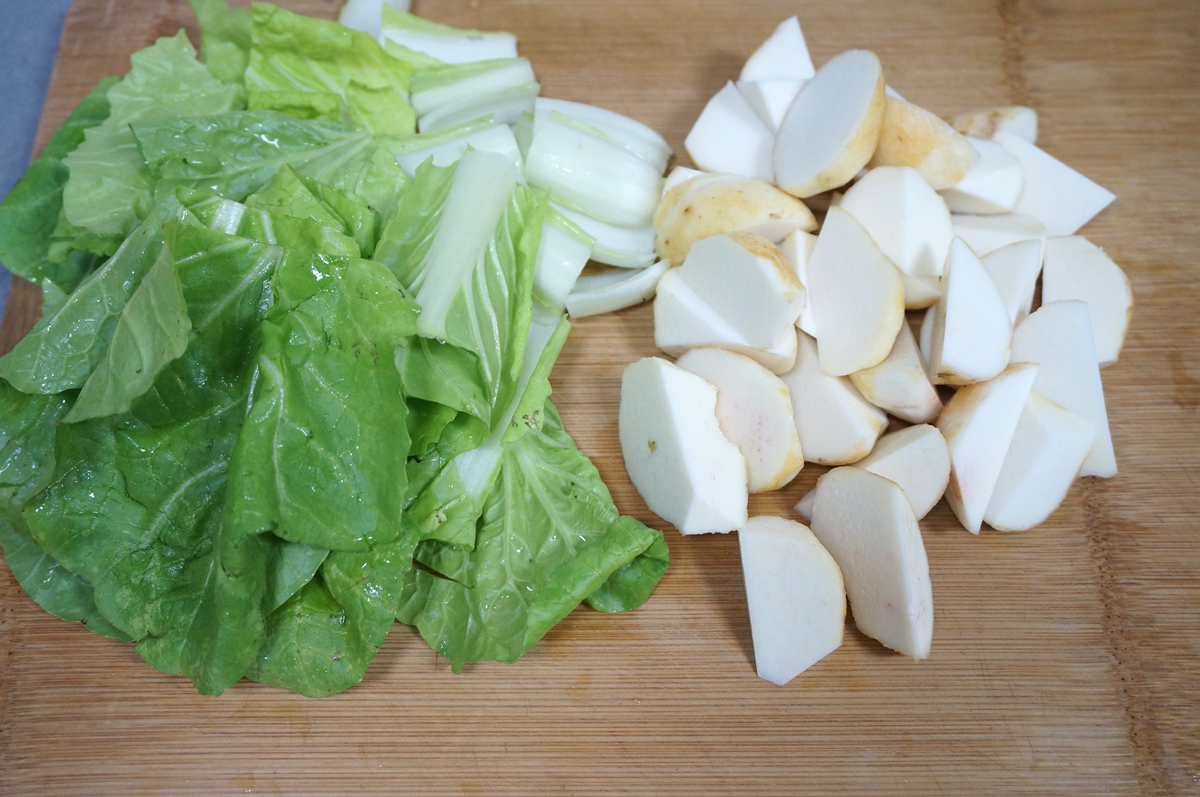 材料:土鸡半只,小芋头5个,小白菜2棵,姜1块,大葱半棵,盐少许,水适量