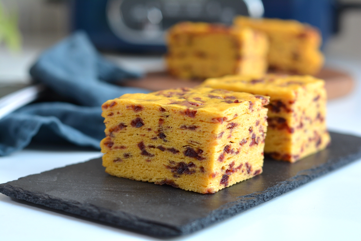 蔓越莓干平时都是放进面包里或者蛋糕里,放进千层蒸饼或者叫蒸糕里显得有些奢侈吧?想必这酸酸甜甜的味道也是吸引人的原因。南瓜靠近瓤的地方会有些筋,如果想让面团更加细腻,南瓜切块蒸熟后要碾成泥状。如果有料理机就方便了,打1分钟就成糊糊了。如果没有料理机可以过下筛;再或者懒且不介意成品模样,就直接碾成糊糊揉进面团里,咱们又不是做买卖,省时省事好吃有营养是主要的。