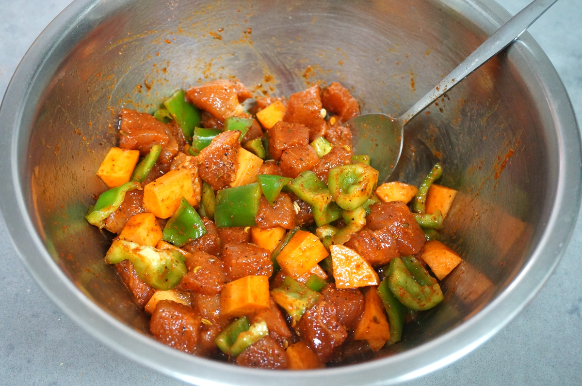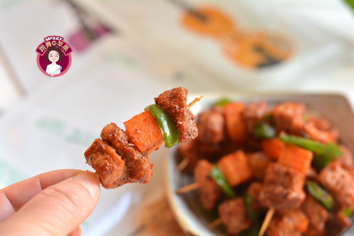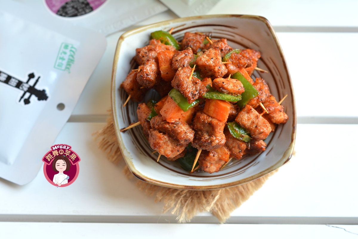 猪瘦肉切1-2公分的小丁,用腌肉料腌至少20分钟。腌肉料可以超市买现成的,我用的土耳其风味的,里面有辣椒和孜然,虽然是猪肉,吃起来却有烤羊肉串的味道啦!如果是自己调的腌料汁,也无非就是生抽、蚝油、白糖、盐、料酒、辣椒粉、孜然、姜片这些,可以随口味来调整。我又放了一根胡萝卜和青椒,肉块和蔬菜块交替着串成串,又好看还不腻。