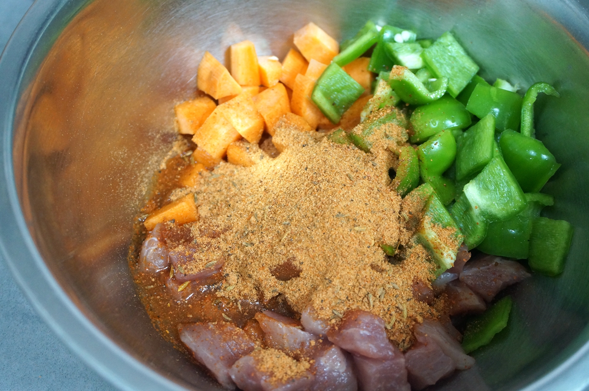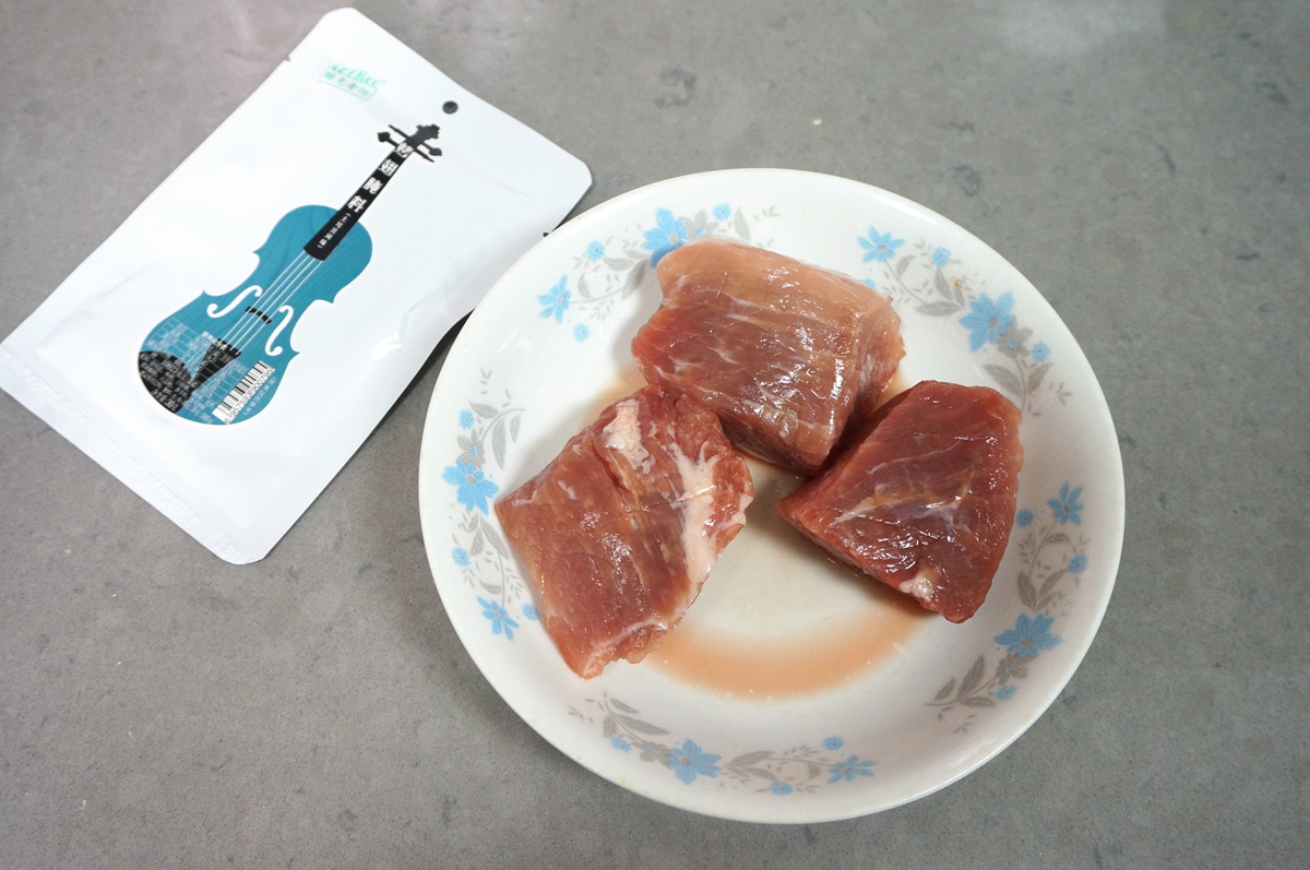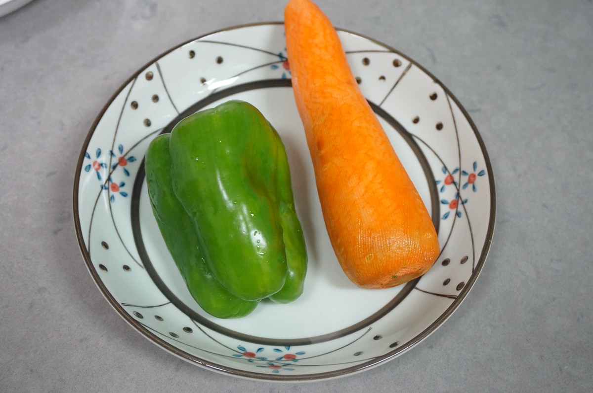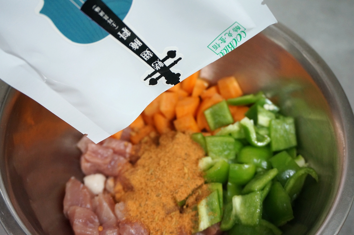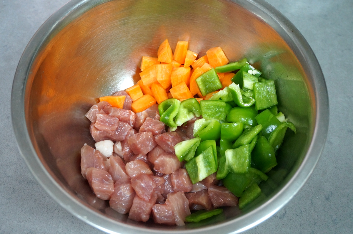 材料:猪肉250克,青椒1个,胡萝卜1根,COOK100土耳其风味腌肉料50克,凉水30克,植物油适量