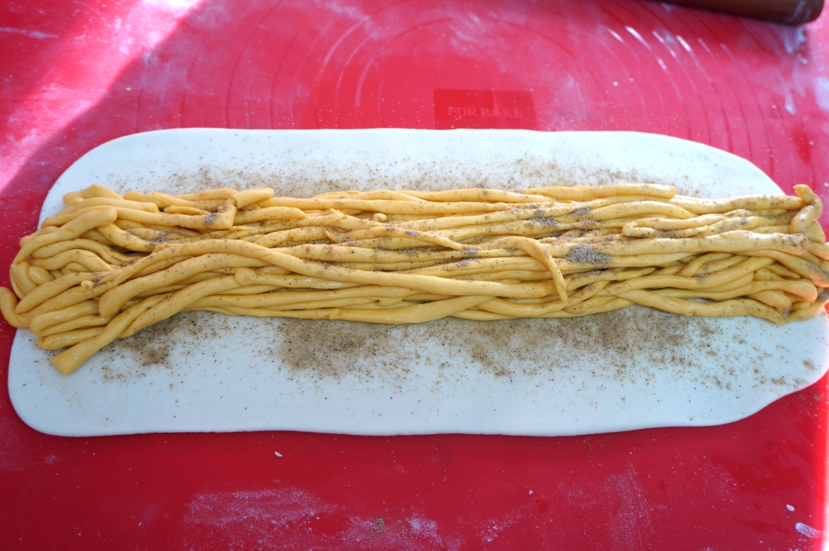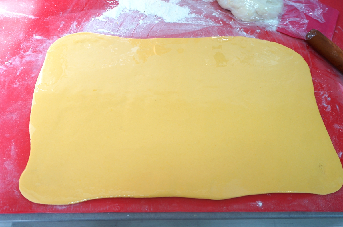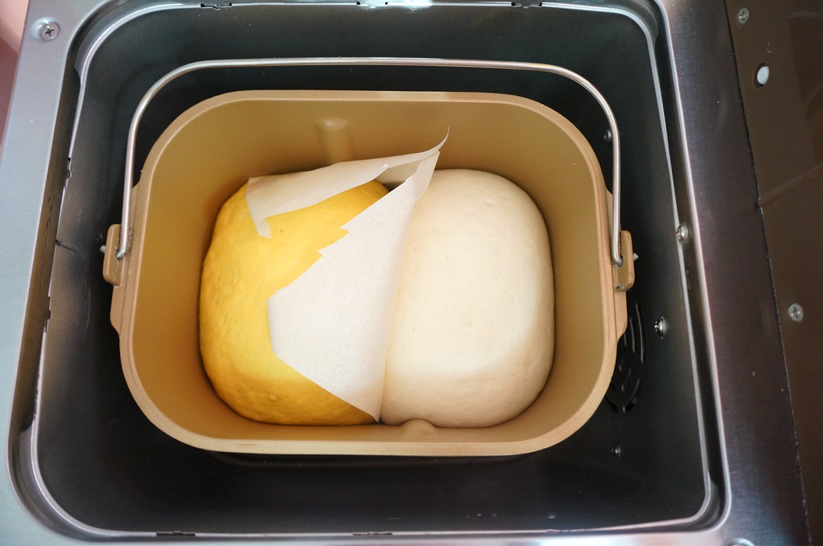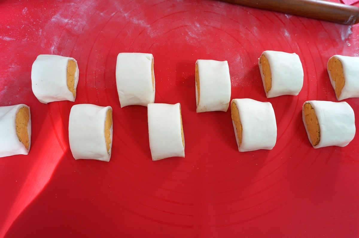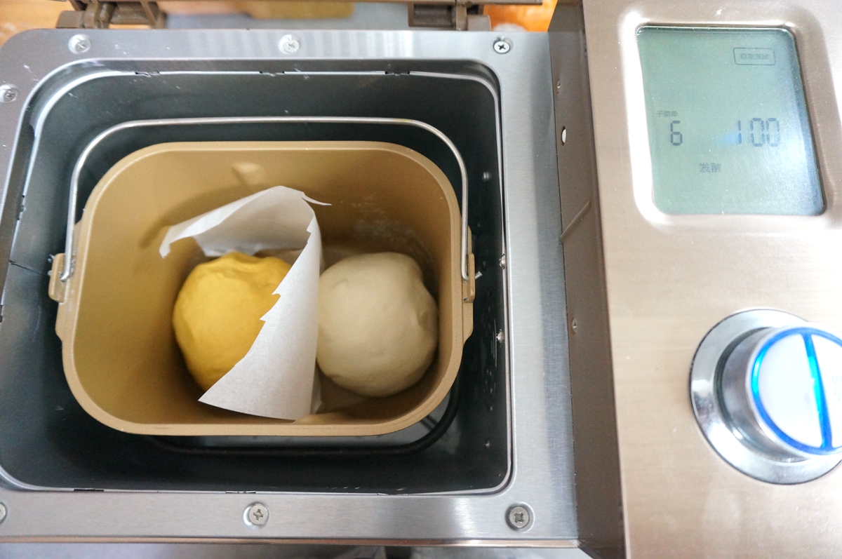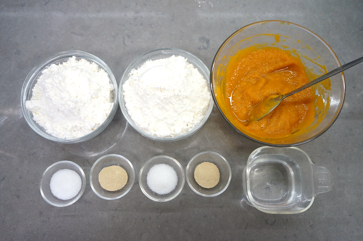 南瓜面团:面粉200克,南瓜泥160克左右,酵母2克,白糖8克