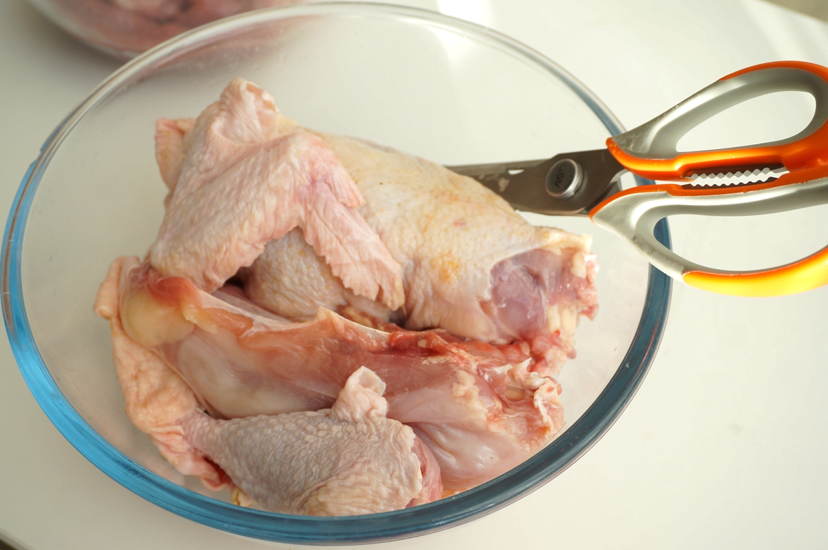 用清水将鸡里外冲洗干净,表皮上的杂毛再拔干净,指甲剪掉,用厨房剪刀沿着关节将整鸡拆成大块;