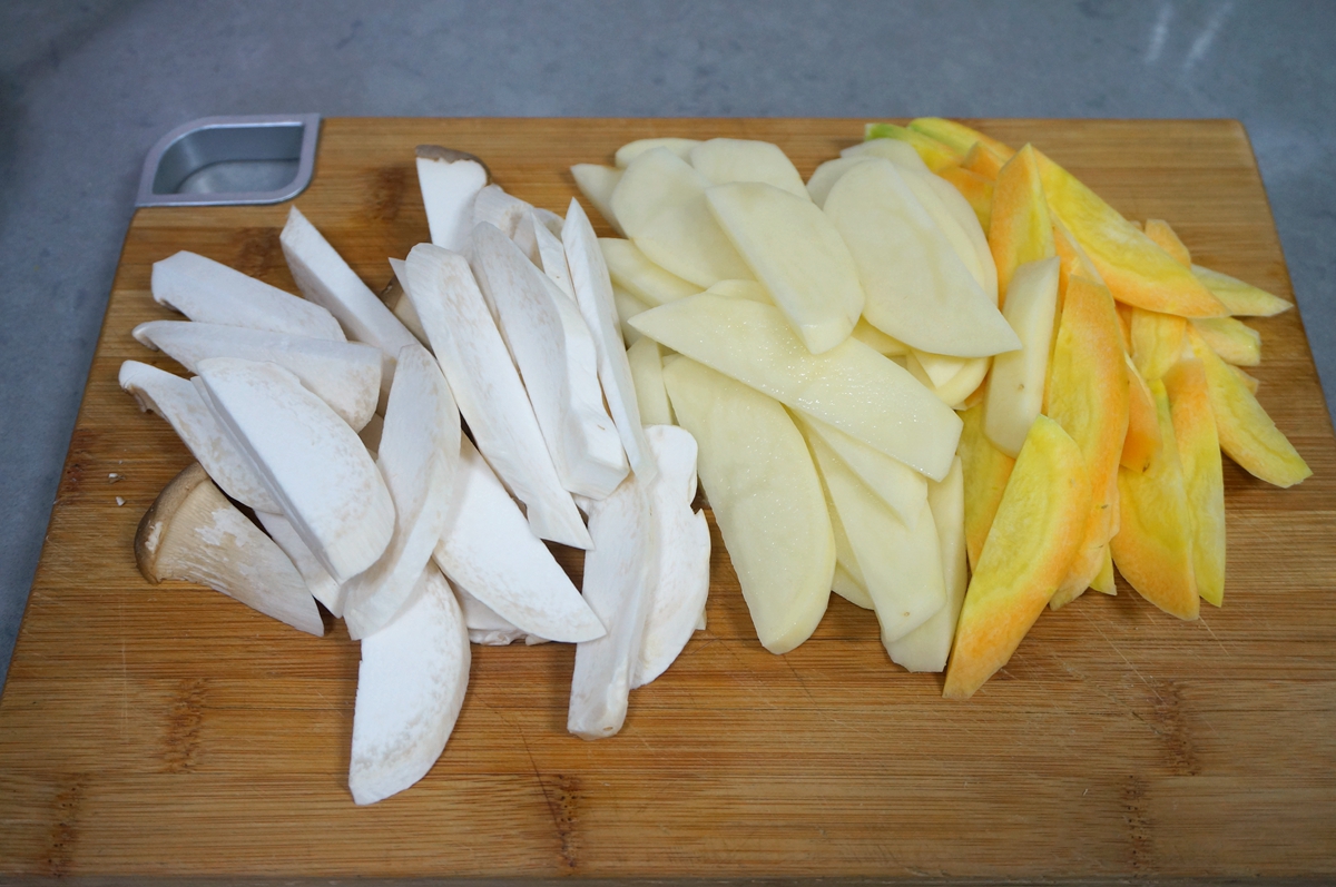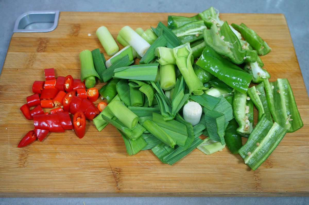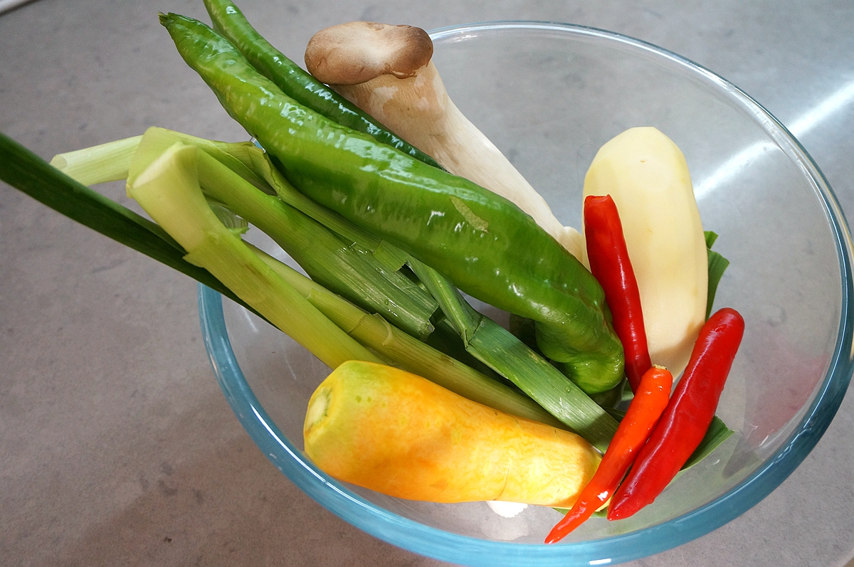 材料:腊肉1条,酸笋3块,酸姜1块,土豆1个,胡萝卜1根,杏鲍菇1根,青辣椒2根,青蒜2根,红辣椒3个,大蒜2瓣,油少许,盐少许,酱油少许
