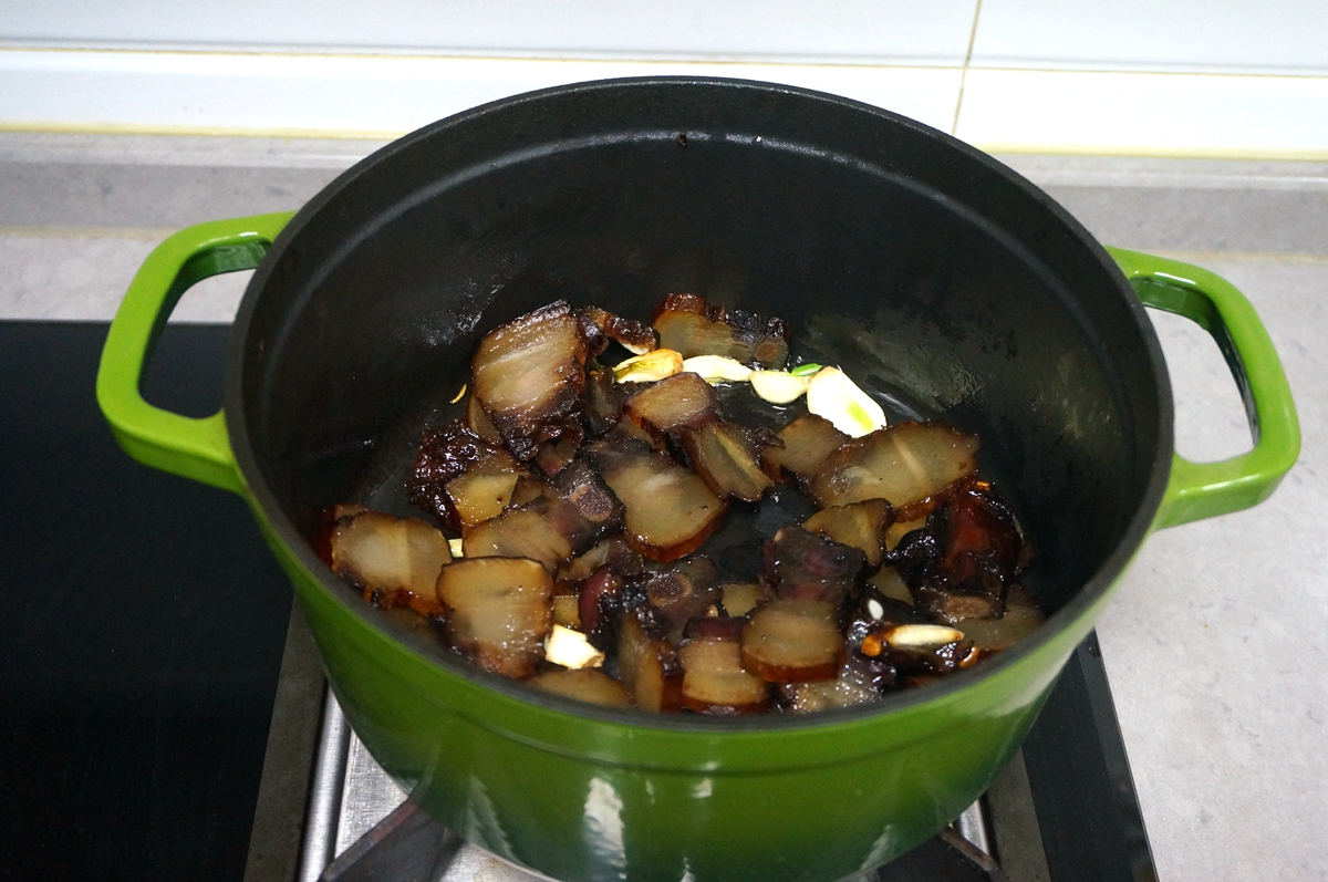 腊肉在晾晒和储存过程中会有一些浮尘,做之前用水煮一下,不但可以把表面杂质去除,还能增加柔软度,在后面的操作中也不会因为太干而影响口感。脆嫩的酸笋有酸味,可以解腻,再加上胡萝卜、土豆、辣椒、青椒等,这一大锅让全家吃得很满足。恰好我家有一个小吊锅,可以用酒精加热,有了小火苗的“爱抚”,腊肉、酸笋和青蒜的香气弥漫在空中,让人觉得这个冬天其实并没那么冷。