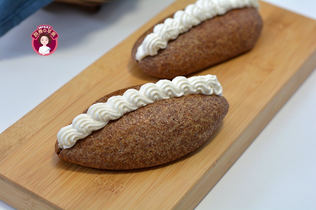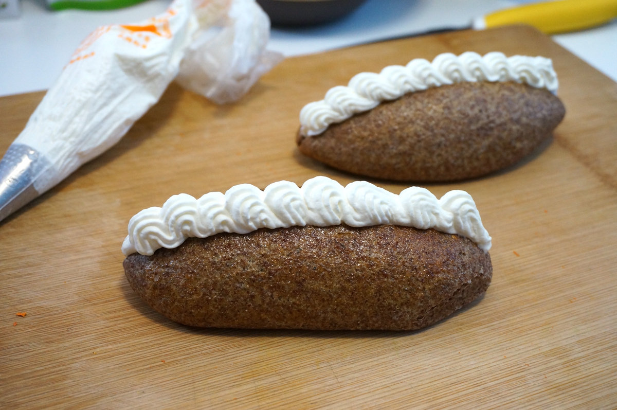14. 提前将一个裱花嘴入裱花袋中,将适量奶油入袋中,将小餐包纵向从中间切一刀,但不要切断,将奶油先挤一条在刀口底部,再挤花边在顶部,一个奶油餐包就完成了。有了香甜奶油的介入,即使是粗糙的黑全麦面包也精致好吃了,尤其受小朋友的喜欢。
