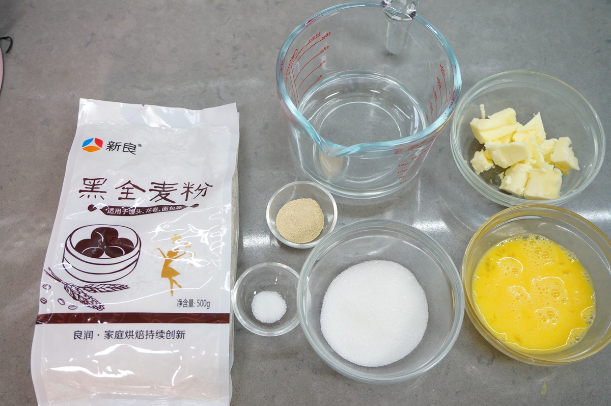 材料:新良黑全麦粉250克,鸡蛋50克,凉水120克,盐1克,细砂糖30克,干酵母3克,黄油
