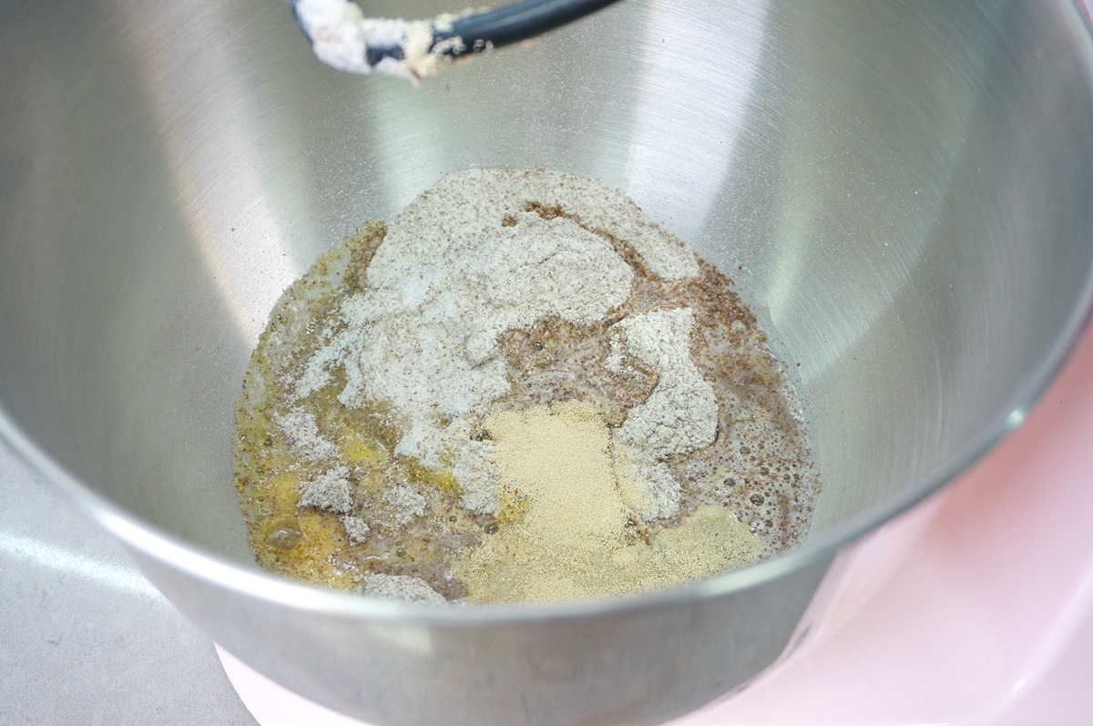 2. 面粉称重后入揉面盆中,依次倒入盐、白糖、鸡蛋液、凉水、干酵母;
