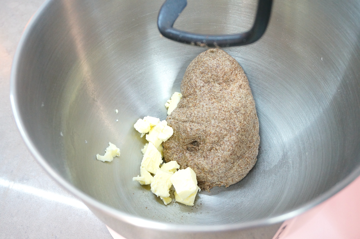 3. 将揉面盆安放在厨师机上,安装上揉面钩,先用低速将材料混合成光滑的面团,待面团能拉出粗膜后,加入黄油;
