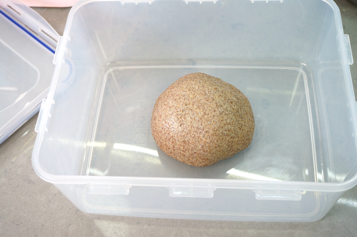5. 将面团收圆,放在发酵盒里,我的这个发酵盒其实就是一个大号的保鲜盒,有盖子,密封性好;如果没有这样的盒子,放在玻璃盆里蒙保鲜膜也是没有问题的;