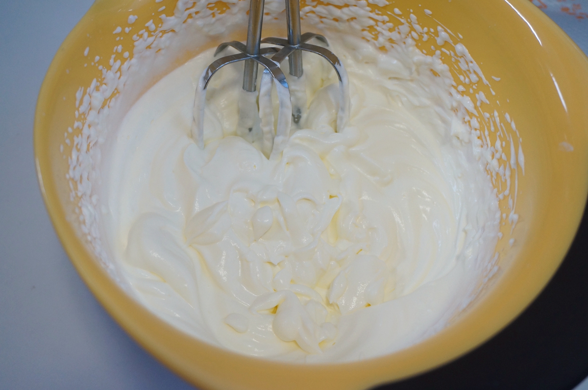 13. 冷藏8小时以上的动物淡奶油100克(图片中的量有点多),加10克细砂糖,用电动打蛋器打到9成发,出现明显纹路且奶油缓慢流动状就可以了;