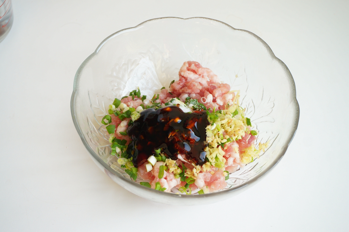 肉馅中放香葱末、姜末、盐、蚝油,想吃颜色重的还可以放适量酱油;