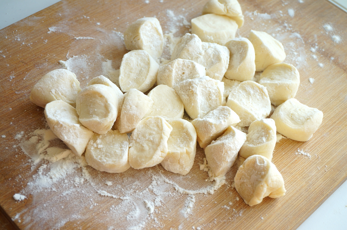 饧好的面团放在案板上,撒适量面粉搓成长条,切成大小均匀的剂子;